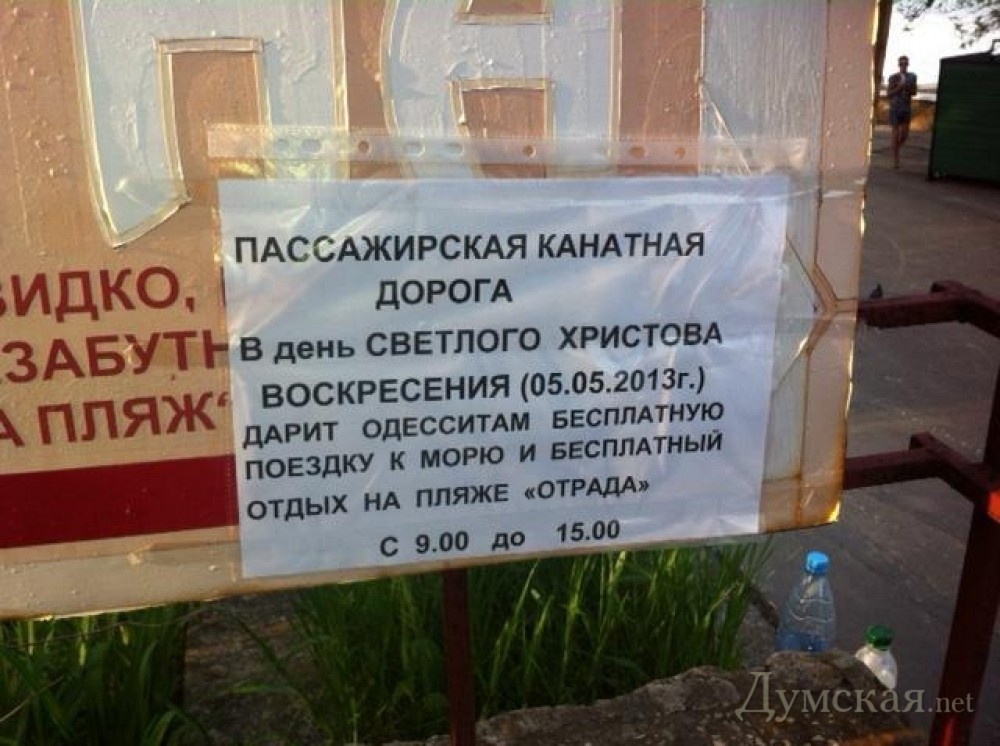 Интересно, что кроме десятиминутной поездки на «канатке», администрация обещает в этот день организовать бесплатный отдых на пляже «Отрада». Вероятно, речь идет о небольшом участке пляжа, расположенном прямо под канатной дорогой, куда проход в другое время был закрыт.