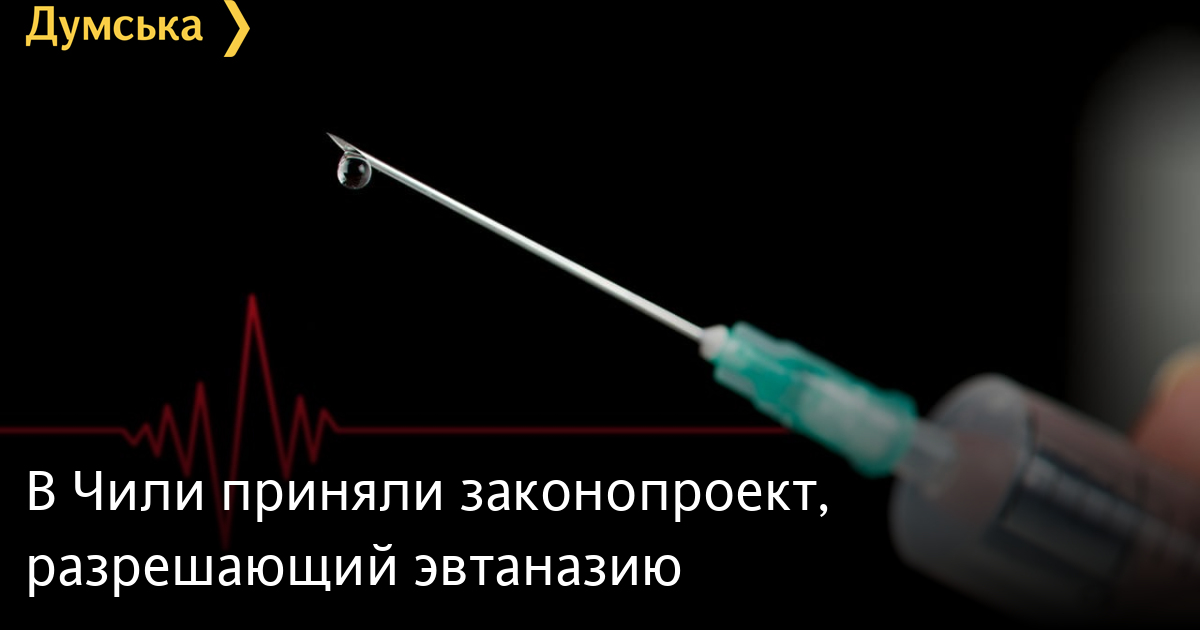 Нижняя палата чилийского парламента 20 апреля одобрила законопроект, разрешающий эвтаназию. Указанный законопроект был внесен в парламент еще семь лет назад, сообщает lefigaro. В соответствии с законопроектом, правом добровольного ухода из жизни смогут воспользоваться пациенты, достигшие 18-летнего возраста, «страдающие неизлечимыми, необратимыми и прогрессирующими болезнями, без возможности ответа на лечебные процедуры и с ограниченной продолжительностью жизни». В законопроекте также отмечается, что для того, чтобы просить об эвтаназии, пациент должен быть в сознании и здравом уме. СМЕРТЬ РОССИЙСКИМ ОККУПАНТАМ! Заметили ошибку? Выделяйте слова с ошибкой и нажимайте control-enter |