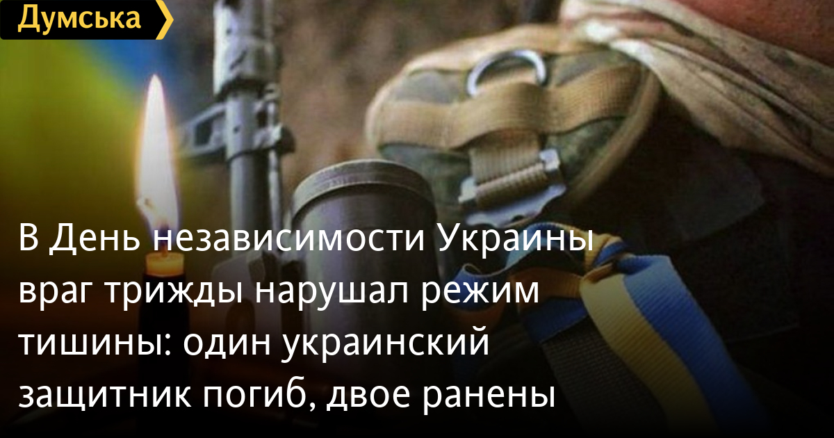 В День независимости Украины враг трижды нарушал режим тишины: один украинский защитник погиб, двое раненыРоссийско-оккупационные войска трижды нарушили режим прекращения огня 24 августа в зоне проведения Операции объединенных сил, в результате чего погиб разведчик одесской мехбригады и двое военнослужащих получили ранения. Об этом сообщается в утренней сводке штаба ООС. Вблизи Новомихайловки и Причепиловки российские наемники обстреливали украинские позиции из стрелкового оружия. На Луганщине и в Донецкой области был зафиксирован пролет вражеского беспилотного летательного аппарата типа «Орлан-10» с пересечением линии разграничения. В результате вражеского обстрела один военнослужащий Объединенных сил погиб от пули российского снайпера, еще двое получили ранения. Воины были срочно эвакуированы и доставлены в лечебное учреждение. Состояние здоровья одного защитника – тяжелое, другого – удовлетворительное. СМЕРТЬ РОССИЙСКИМ ОККУПАНТАМ! Заметили ошибку? Выделяйте слова с ошибкой и нажимайте control-enter |