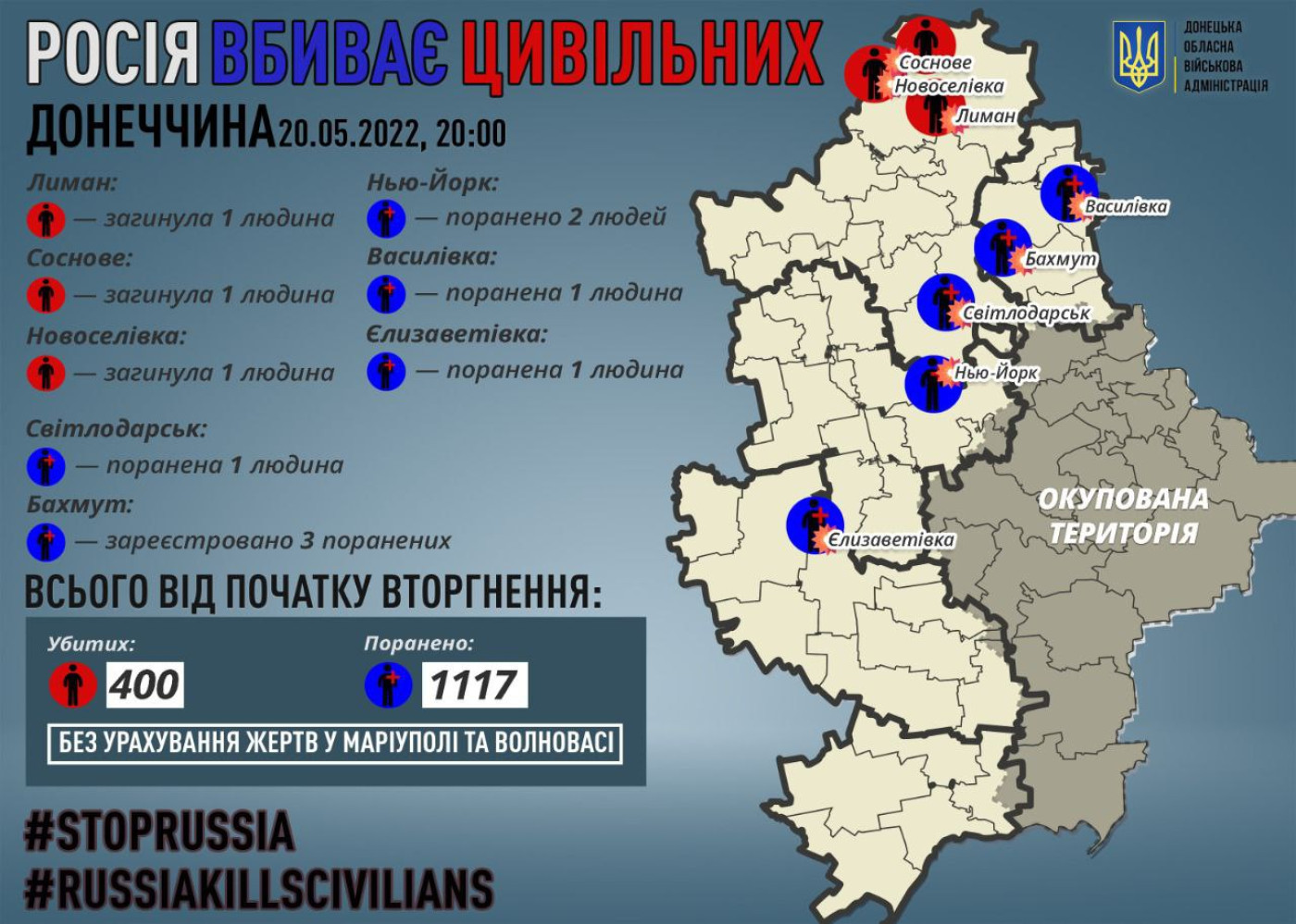 В результате боевых действий со стороны РФ в Донецкой области 20 мая погибли 3 мирных жителя, а с начала вторжения известно о 400 убитых. Об этом сообщил глава Донецкой ОВА Павел Кириленко. «За 20 мая россияне убили еще троих мирных жителей Донбасса, все трое – в Лиманской общине: в Лимане, Новоселовке и Сосновом. Всего с начала полномасштабного вторжения нам точно известно о 400 убитых россиянами гражданских в Донецкой области», — отметил глава ОВА. Кроме того, 20 мая из-за обстрелов оккупантов получили ранения пять человек. Также в Бахмуте медицинскую помощь получили три человека, раненых в Луганской области. Кириленко напомнил, что пока невозможно установить точное количество жертв в Мариуполе и Волновахе. СМЕРТЬ РОСІЙСЬКИМ ОКУПАНТАМ! Помітили помилку? Виділяйте слова з помилкою та натискайте control-enter |