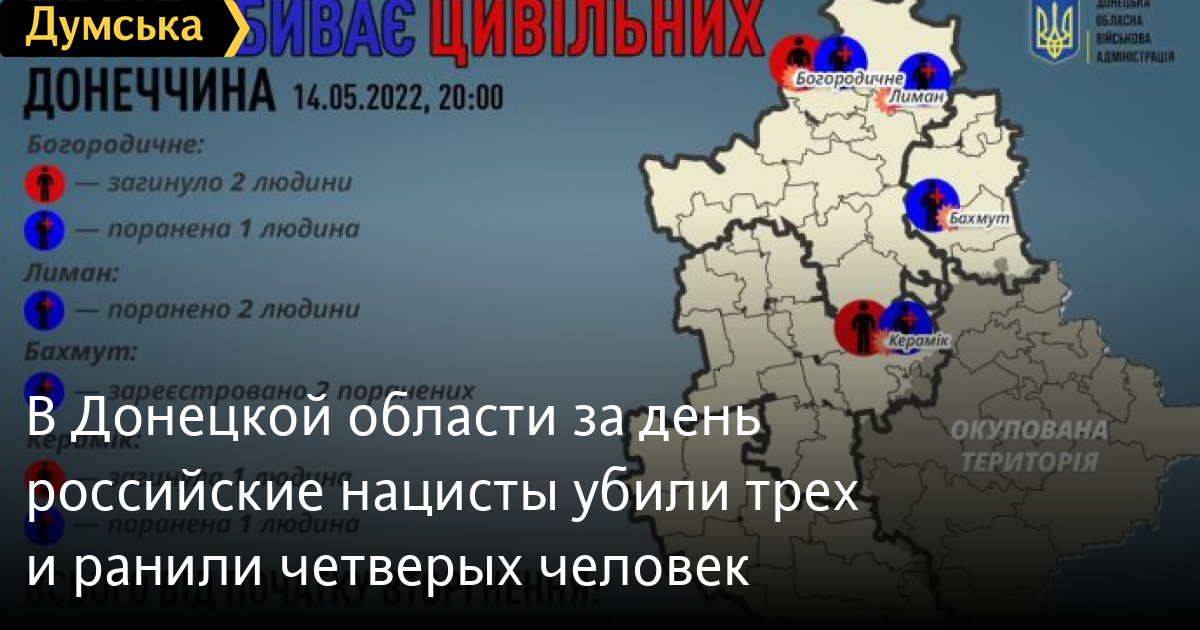 В Донецкой области за день российские нацисты убили трех и ранили четверых человекВ результате действий российских оккупантов в Донецкой области 14 мая погибли три человека, четверо получили ранения. Об этом сообщил глава Донецкой ОВА Павел Кириленко. «За 14 мая россияне убили 3 мирных жителей Донецкой области: 2 в Богородичном и 1 в Керамике. Еще 4 человека получили ранения», — отметил глава ОВА. СМЕРТЬ РОССИЙСКИМ ОККУПАНТАМ! Заметили ошибку? Выделяйте слова с ошибкой и нажимайте control-enter |