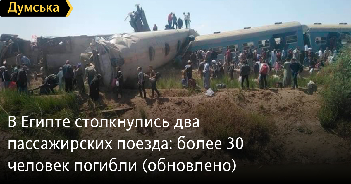В Египте столкнулись два пассажирских поезда: более 30 человек погибли (обновлено)Сегодня в Египте столкнулись два пассажирских поезда, в результате чего погибли минимум 32 человека, а 84 - получили ранения. Об этом сообщила пресс-служба Министерства здравоохранения Египта. Авария произошла в городе Тахта провинции Сохаг. Что стало причиной столкновения пока не сообщается. Как пишут местные СМИ, один из поездов врезался сзади в другой. В результате столкновения три пассажирских вагона сошли с рельсов. На место трагедии отправили 36 машин скорой помощи. Египетская прокуратура распорядилась начать расследование по факту случившегося, а министр транспорта приказал задержать машинистов обоих поездов. ОБНОВЛЕНО в 17:00. Стало известно, что авария произошла из-за того, что поезд, который следовал из Луксора в Александрию, совершил резкую остановку. Кто-то дернул в поезде стоп-кран. СМЕРТЬ РОССИЙСКИМ ОККУПАНТАМ! Заметили ошибку? Выделяйте слова с ошибкой и нажимайте control-enter |