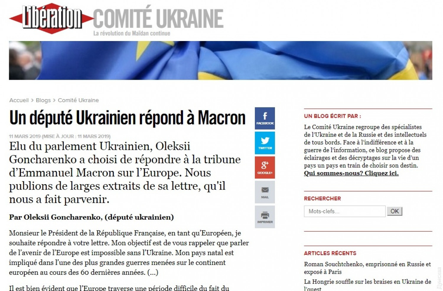 Во французской газете Liberation напечатали ответ депутата Гончаренко на письмо Макрона: «Европа невозможна без Украины»