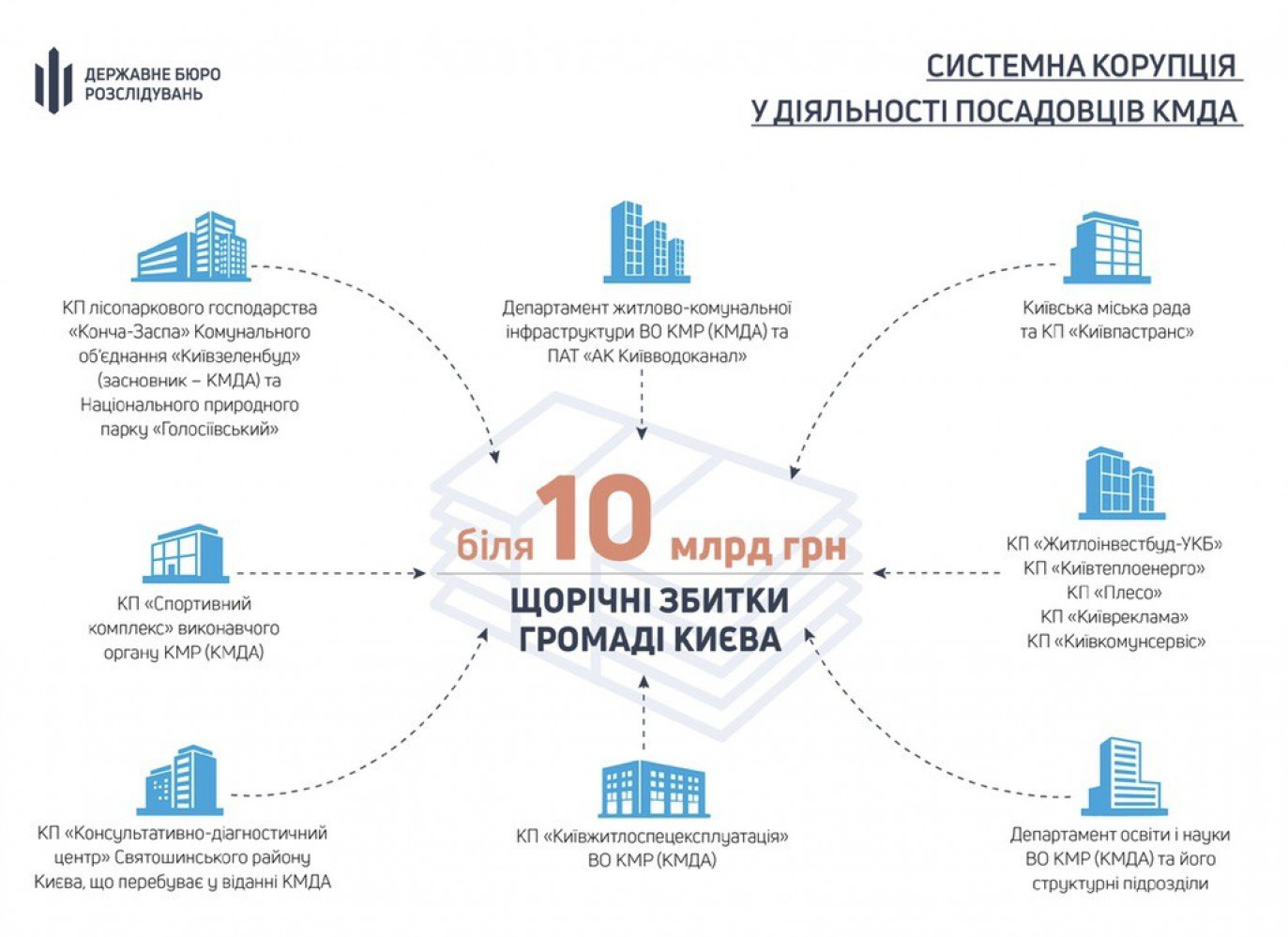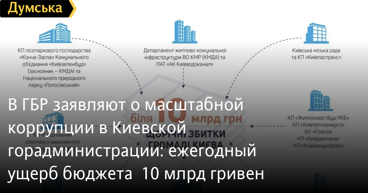 В ГБР заявляют о масштабной коррупции в Киевской горадминистрации: ежегодный ущерб бюджета — 10 млрд гривенИнформацию о масштабной коррупции в работе столичных органов местного самоуправления и коммунальных предприятий обнародовали в Государственном бюро расследований. По предварительным оценкам ведомства, системная коррупция чиновников Киевской городской государственной администрации наносит ущерб территориальной громаде столицы на общую сумму примерно 10 млрд грн. «Анализ существующей в бюро информации свидетельствует о том, что руководство и должностные лица структур КГГА с использованием власти и предоставленных им полномочий наладили устойчивые коррупционные схемы хищения бюджета города Киева, который сегодня составляет примерно 60 млрд гривен», — утверждают в Бюро. Сообщается, что основной механизм разворовывания связан с работой 128 коммунальных предприятий, на которые бесконтрольно и неэффективно распределяют деньги. На КП направляется ежегодно более 20 млрд гривен. На сегодняшний день ГБР расследует возможные нарушения, допущенные руководством десятка предприятий и их должностных лиц. СМЕРТЬ РОССИЙСКИМ ОККУПАНТАМ! Заметили ошибку? Выделяйте слова с ошибкой и нажимайте control-enter |