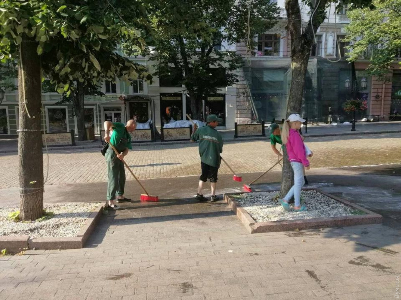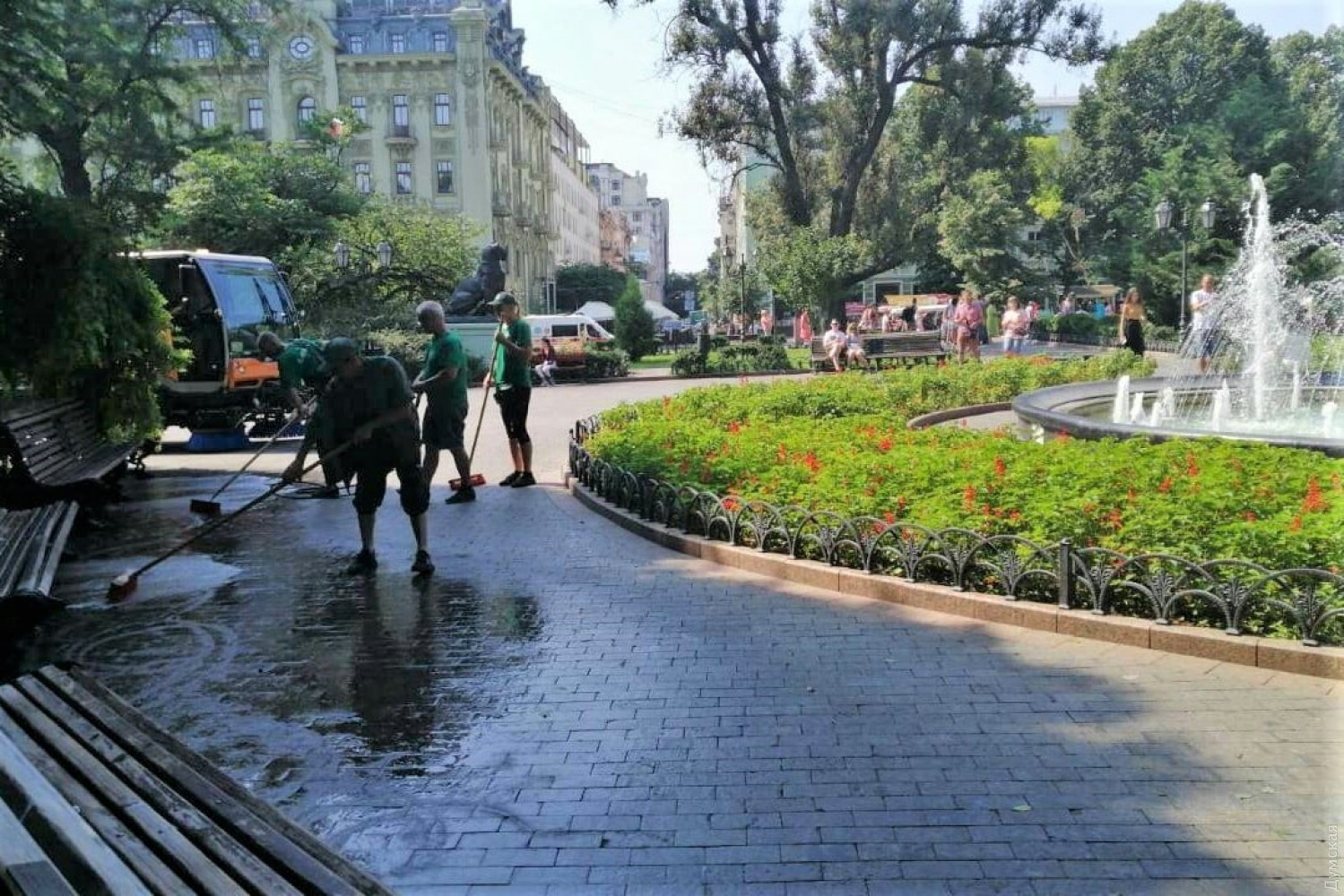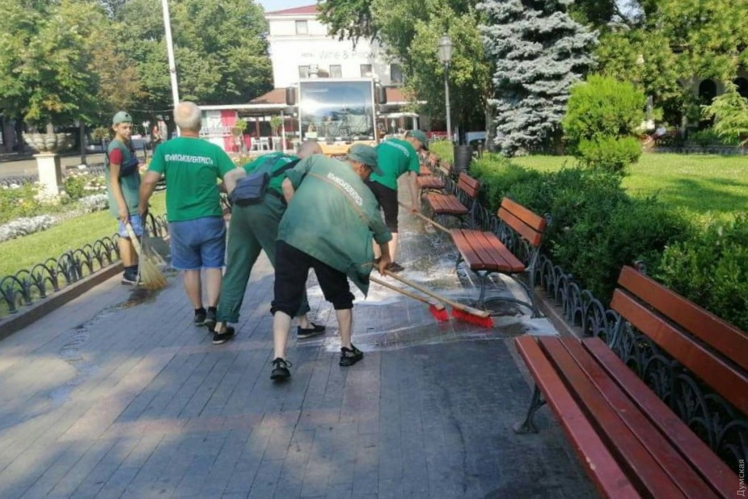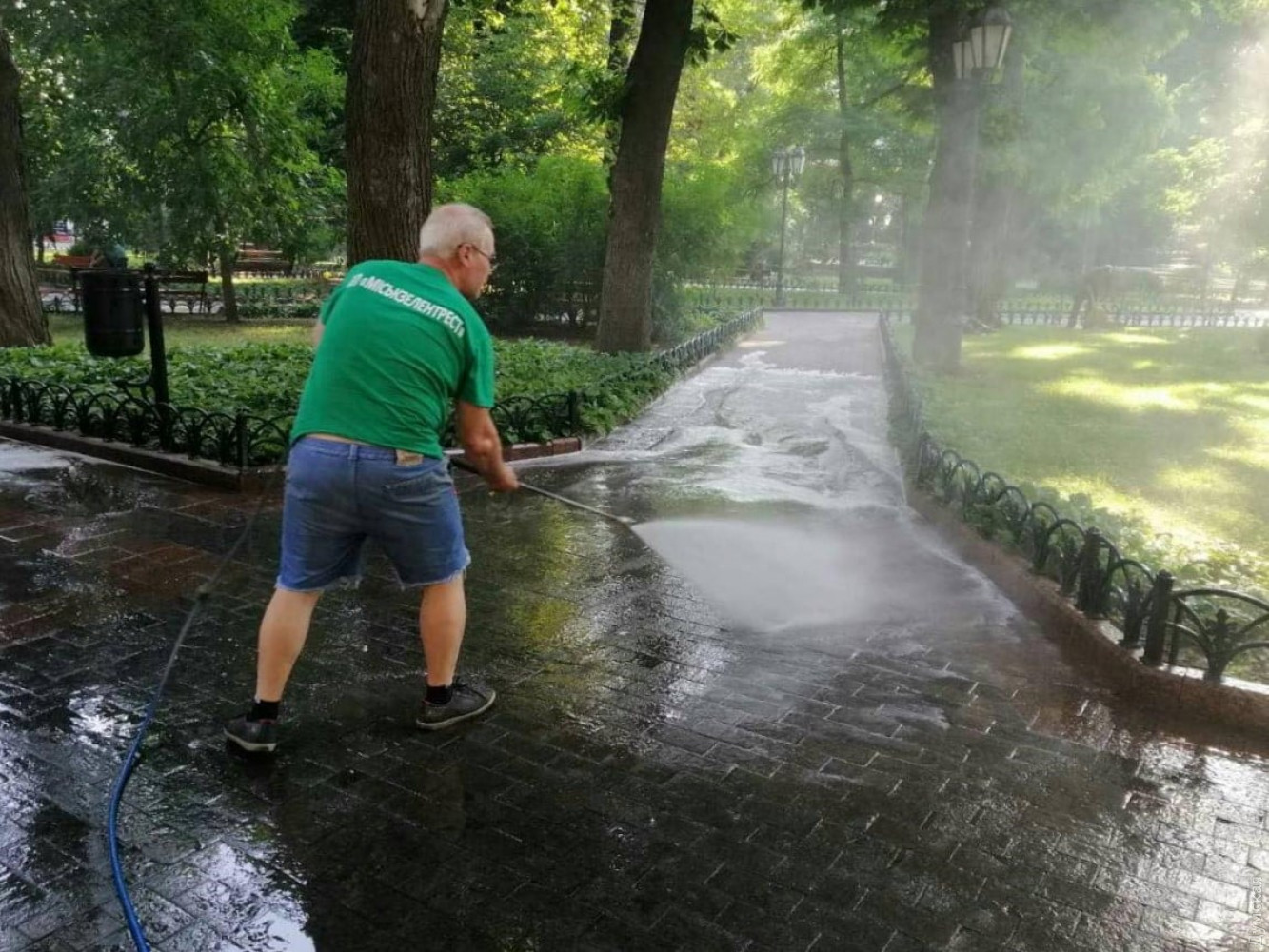 Сотрудники КП «Горзелентрест» утром 25 июля отмыли тротуар в Горсаду.