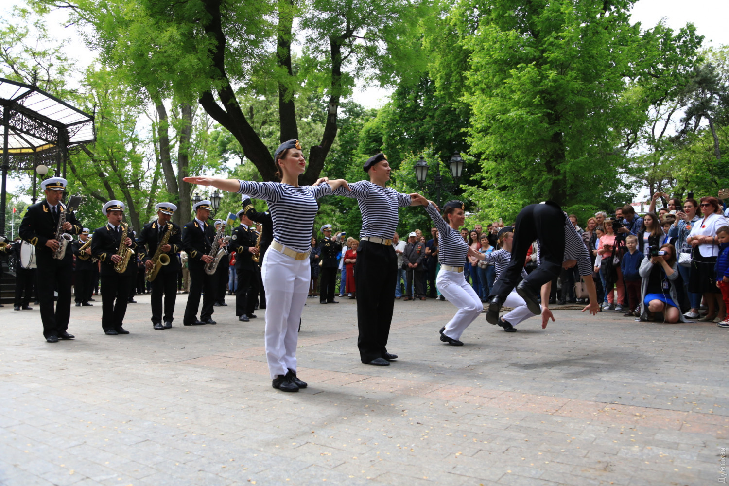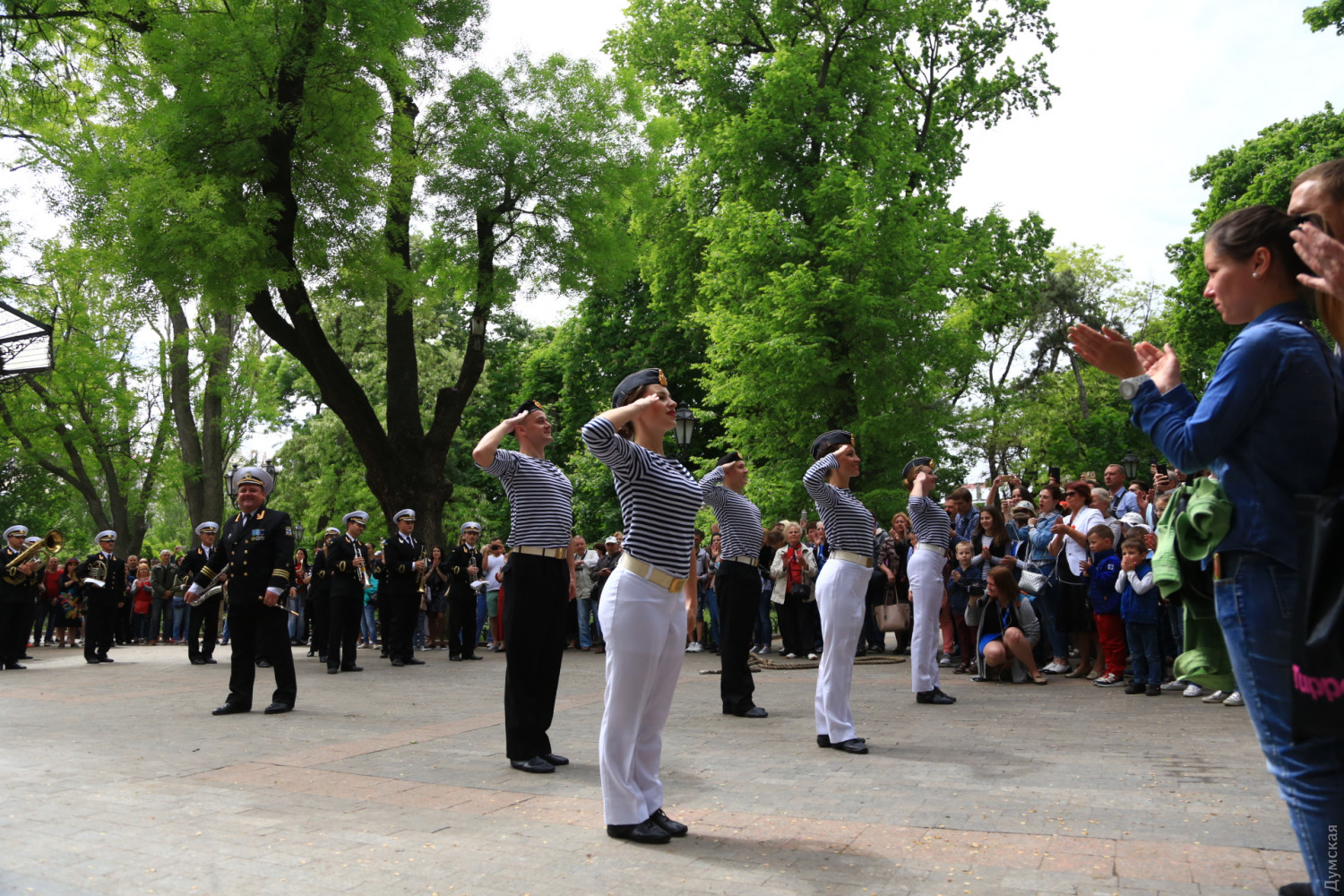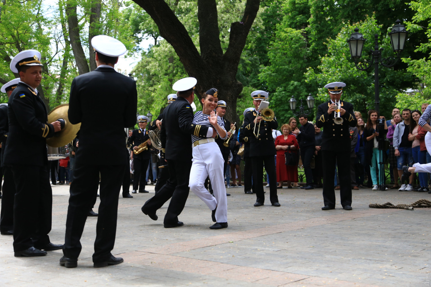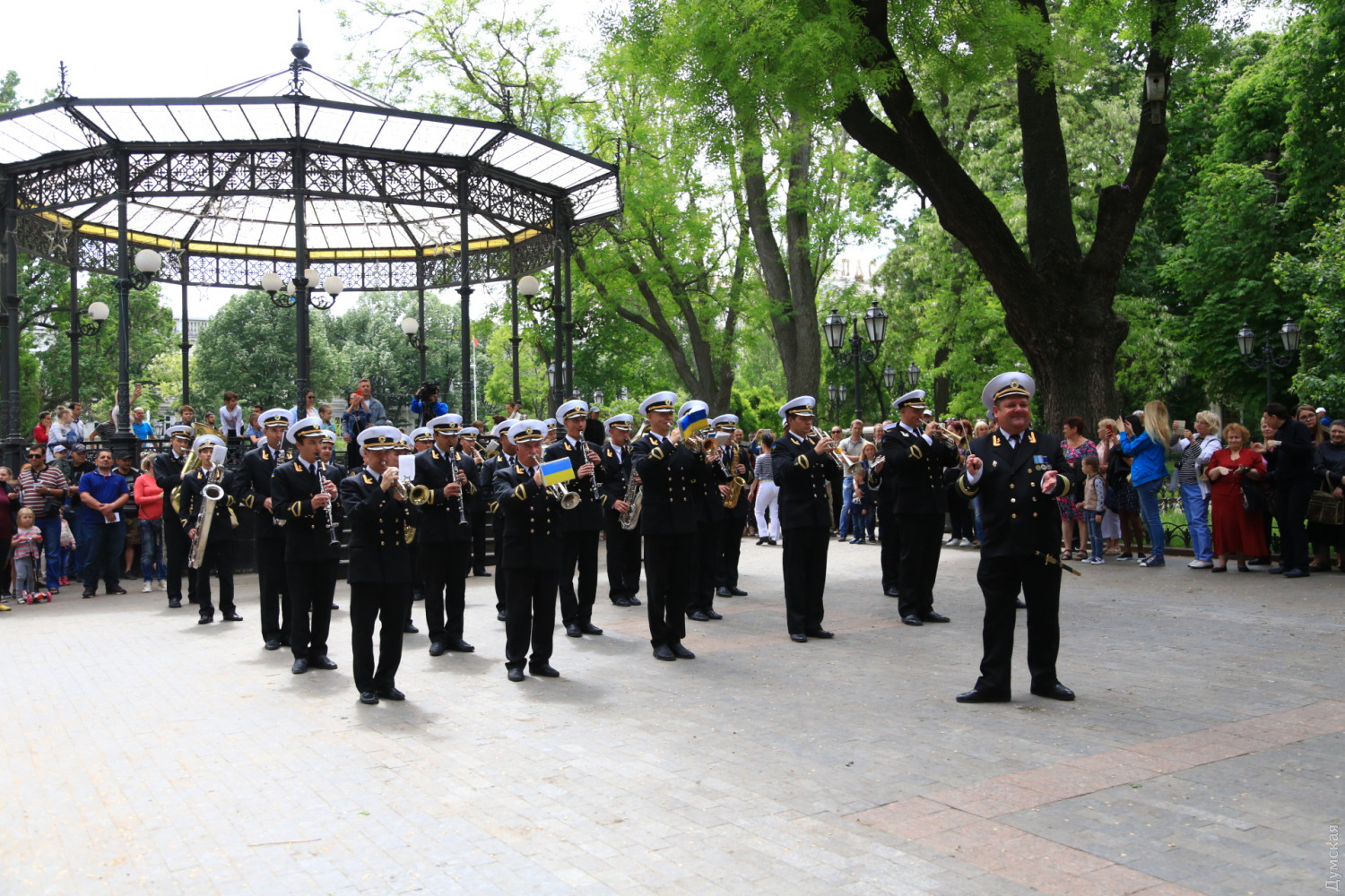 Военные и гражданские духовые оркестры играли сегодня в разных районах Одессы. Концерты были приурочены к 73-й годовщине победы над германским нацизмом, передает корреспондент «Думской». Так, несколько сотен одесситов аплодировали оркестру Военно-морских сил Украины, который в полдень выступал у ротонды в Городском саду. Для публики звучала военная лирика и популярные мелодии послевоенных лет. Не обошлось без традиционных одесских песен. Перед зрителями также выступили флотские танцоры. В парке культуры и отдыха им. Максима Горького играл оркестр управления Южного территориального командования Национальной гвардии Украины и 49 полка охраны общественного порядка НГУ.