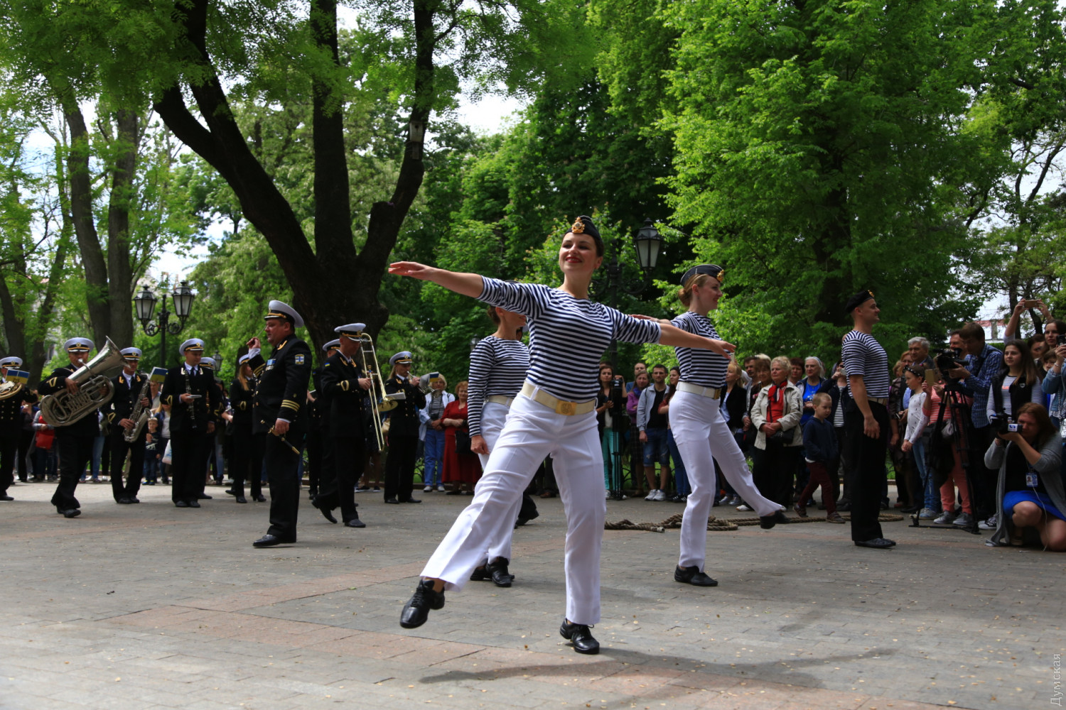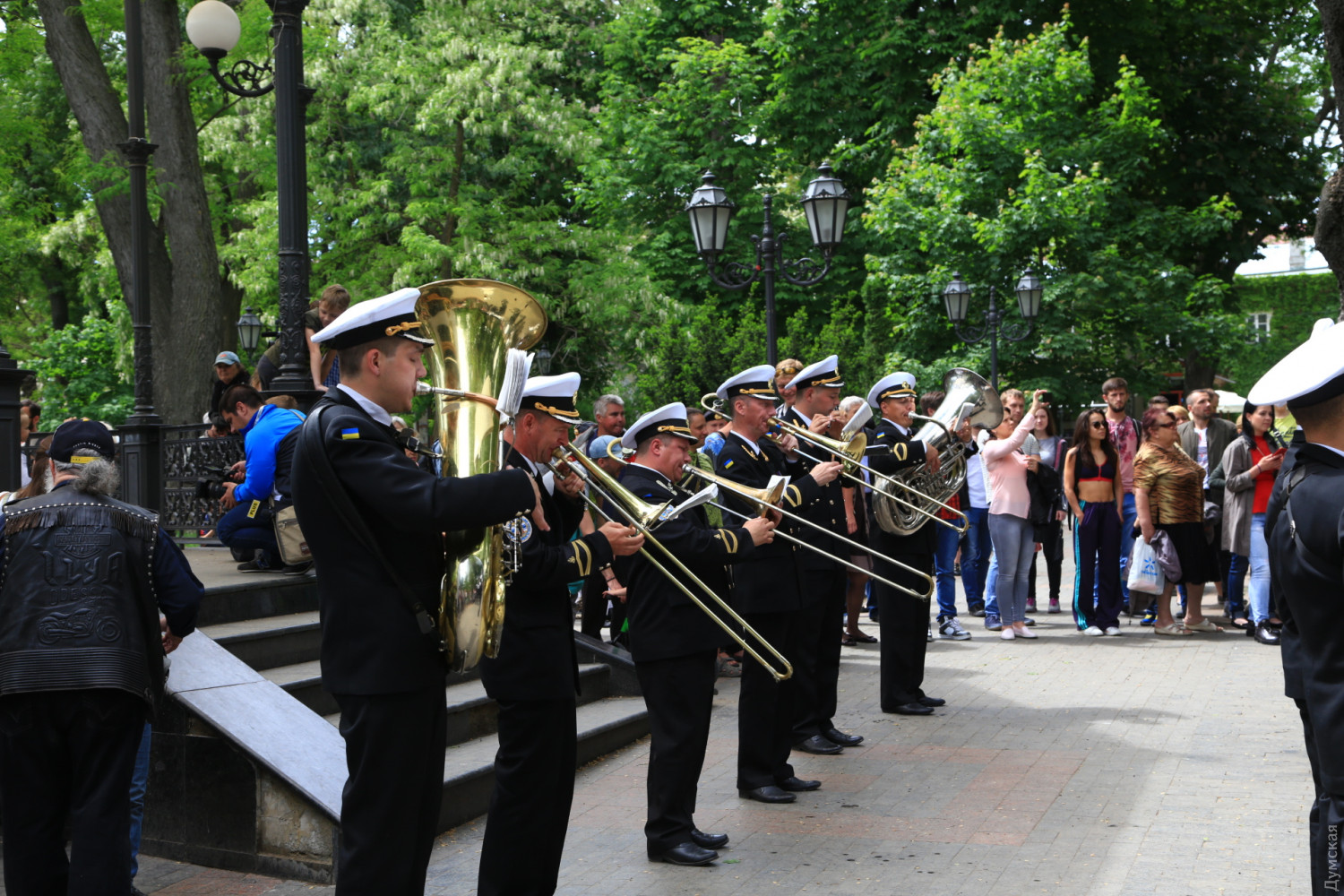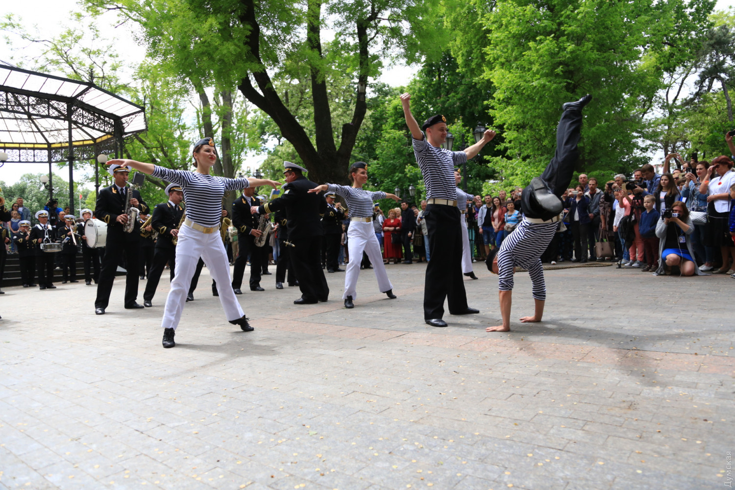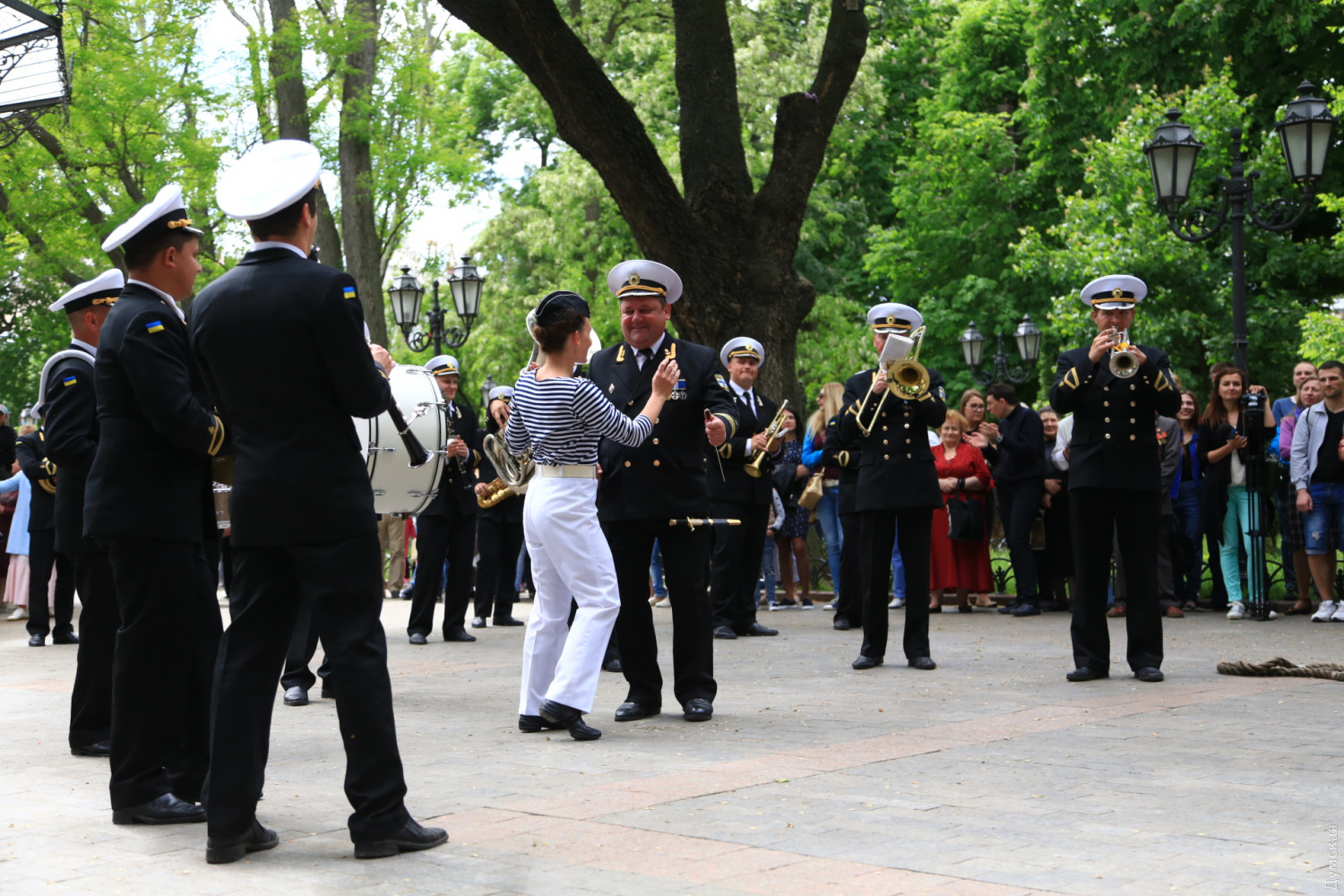 Военные и гражданские духовые оркестры играли сегодня в разных районах Одессы. Концерты были приурочены к 73-й годовщине победы над германским нацизмом, передает корреспондент «Думской». Так, несколько сотен одесситов аплодировали оркестру Военно-морских сил Украины, который в полдень выступал у ротонды в Городском саду. Для публики звучала военная лирика и популярные мелодии послевоенных лет. Не обошлось без традиционных одесских песен. Перед зрителями также выступили флотские танцоры. В парке культуры и отдыха им. Максима Горького играл оркестр управления Южного территориального командования Национальной гвардии Украины и 49 полка охраны общественного порядка НГУ.