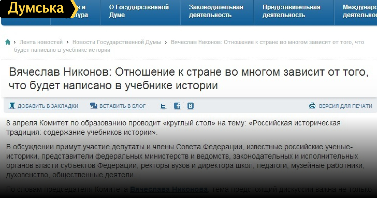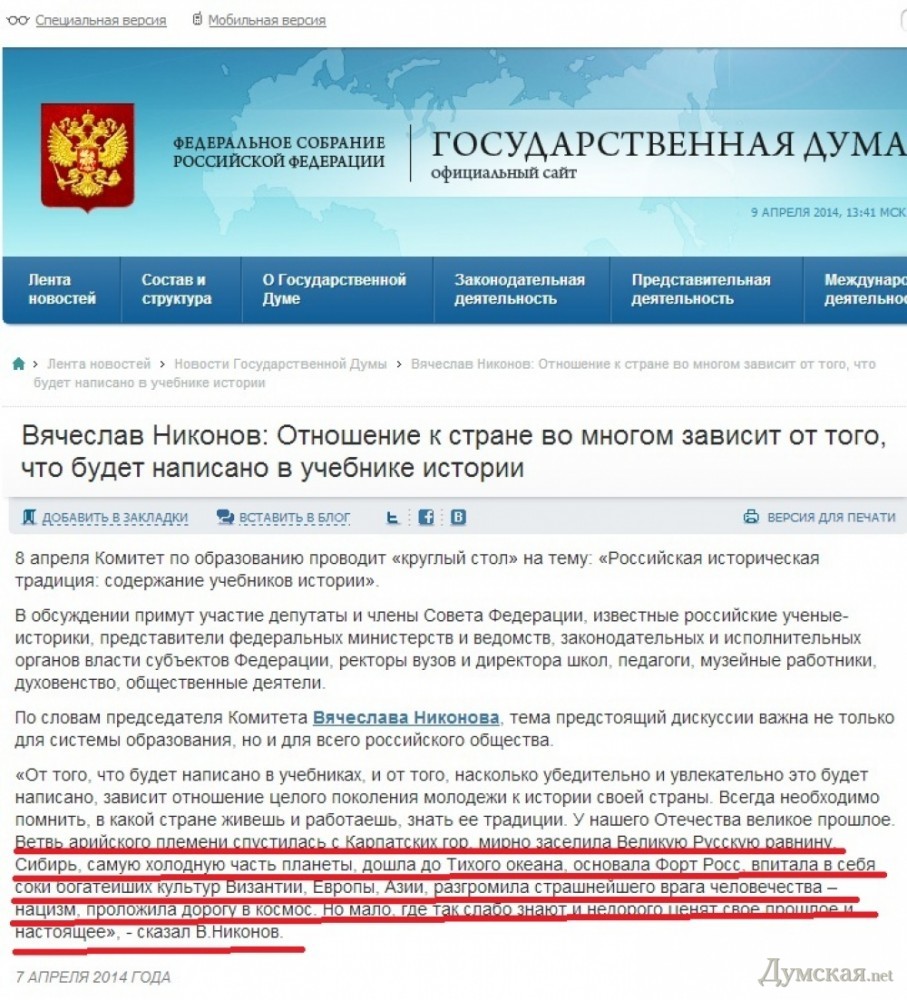 «У нашего Отечества великое прошлое. Ветвь арийского племени спустилась с Карпатских гор, мирно заселила Великую Русскую равнину, Сибирь, самую холодную часть планеты, дошла до Тихого океана, основала Форт Росс, впитала в себя соки богатейших культур Византии, Европы, Азии, разгромила страшнейшего врага человечества – нацизм, проложила дорогу в космос. Но мало, где так слабо знают и недорого ценят свое прошлое и настоящее», — цитирует Никонова пресс-служба российского парламента.