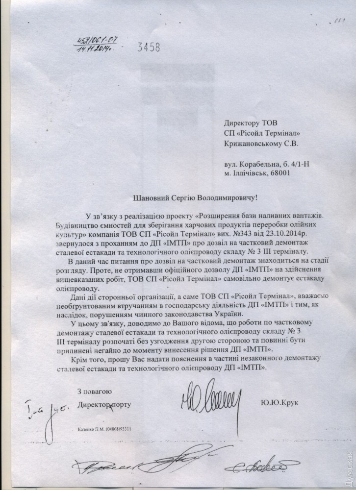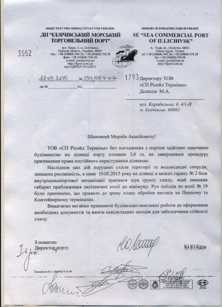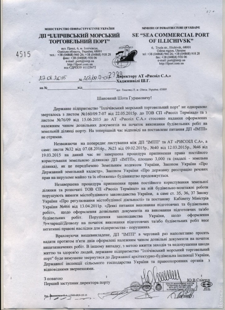 В ИМТП открыли первую очередь зернотерминала, который строился с нарушениями и без необходимых документовСегодня в Ильичевском порту торжественно открыли первую очередь зернового терминала пропускной способностью в 700 тысяч зерна в год. В открытии принимал участие министр аграрной политики и продовольствия Украины Алексей Павленко, который отметил, что строительство современного комплекса для перевалки зерна — это большой шаг в развитии инфраструктуры региона. Все бы хорошо, однако в распоряжение «Думской» попали документы, свидетельствующие о том, что инвестор – ТОВ «Рисол Терминал» (основным владельцем является швейцарская компания АТ «Рисол С. А.») приступил к строительству, не имея на то всех необходимых разрешительных документов. При этом компания фактически самовольно заняла около 1 ГА земли порта, не получив в установленном законом порядке правоустанавливающих документов на данный участок земли. Поясним, что зерновой терминал построен на двух смежных участках земли, один из которых находится в аренде у компании «Рисол», а второй принадлежит ИМТП. В 2015 году директор АТ «Рисол С. А.» Шота Хаджишвили обратился к бывшему начальнику порта Юрию Круку с просьбой отказаться от права принадлежащего ИМТП участка в их пользу. Такая договоренность была достигнута – цена подписания соответствующего договора, согласованного с министерством инфраструктуры, составила 500 тысяч долларов. После этого инвестор должен был обратиться с письмом в порт для передачи земли в ведение областного совета, который по распоряжению ОГА должен был проголосовать за изъятие из пользования портом указанного участка и передачи его коммерсантам. Но такая процедура не была проведена. Несмотря на это строительство продолжилось. Причем, работы велись с нарушением строительных норм и правил без проектной документации. В результате произошел оползень грунта, разрушение лотков ливневой системы и затопление железнодорожной коли, из-за чего несколько раз срывался план обработки грузов порта. Справка: компания АТ «Рисол С.А.» основана в 2000 году в Женеве, Швейцария. Официальным представителем компании в Украине является Хаджишвили Шота Гурамович. СМЕРТЬ РОСІЙСЬКИМ ОКУПАНТАМ! Помітили помилку? Виділяйте слова з помилкою та натискайте control-enter |