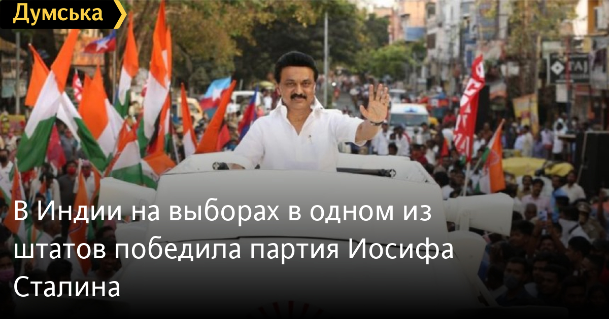 Партия индийского политика Иосифа Сталина «Дравида Муннетра Кажагам» (DMK) выиграла выборы в штате Тамилнад, что на юго-востоке Индии. Об этом сообщает «The Daily Mail». Уточняется, что о победе полного тезки советского деятеля свидетельствуют результаты экзит-полов. Согласно им, политсила Сталина обошла ближайших конкурентов, победив с большим отрывом, и теперь он готовится прийти к власти. При этом отмечено, что официально результаты выборов в Тамилнаде пока не объявили. Их должны огласить в воскресенье, 2 мая. Как стало известно, индийский Иосиф Сталин был назван так его отцом Мутхувелом Карунанидхи Сталиным, «левым» главным министром Индии, который дольше всех занимал этот пост — 6863 дня. Иосиф родился 1 марта 1953 года, за четыре дня до кончины советского лидера, в отличие от тезки-диктатора, он – убежденный демократ. По данным СМИ, как-то в интервью одному из индийских изданий Сталин признался, что его имя вызвало недоумение в России. Он рассказал, что когда прилетел в РФ в 1989 году и представился в аэропорту, люди начали на него странно смотреть. А чиновники долго проверяли паспорт гостя из Индии и задали несколько уточняющих вопросов, прежде чем впустить в страну. Политик добавил, что из всего происходящего понял, что Сталина в СССР многие недолюбливали. При этом он сам, осознав это, почувствовал себя в России очень неловко. СМЕРТЬ РОССИЙСКИМ ОККУПАНТАМ! Заметили ошибку? Выделяйте слова с ошибкой и нажимайте control-enter Новости по этой теме: 23 июня 2021: В Киеве из-за "слуги" Тищенко задержали самолет - все ждали, когда депутат запишет видео для своего блога 22 июня 2021: Американец 60 раз за сутки прыгнул с парашютом голышом - он надеется установить рекорд 17 июня 2021: В румынском городе поселились медведи: они разгуливают по улицам и вламываются в магазины 17 июня 2021: Пара влюбленных была скована цепью 123 дня: в Украине зарегистрировали необычный рекорд 8 июня 2021: Хотел пожать руку, а получил пощечину: французского президента Макрона "тепло" встретили в одном из департаментов |