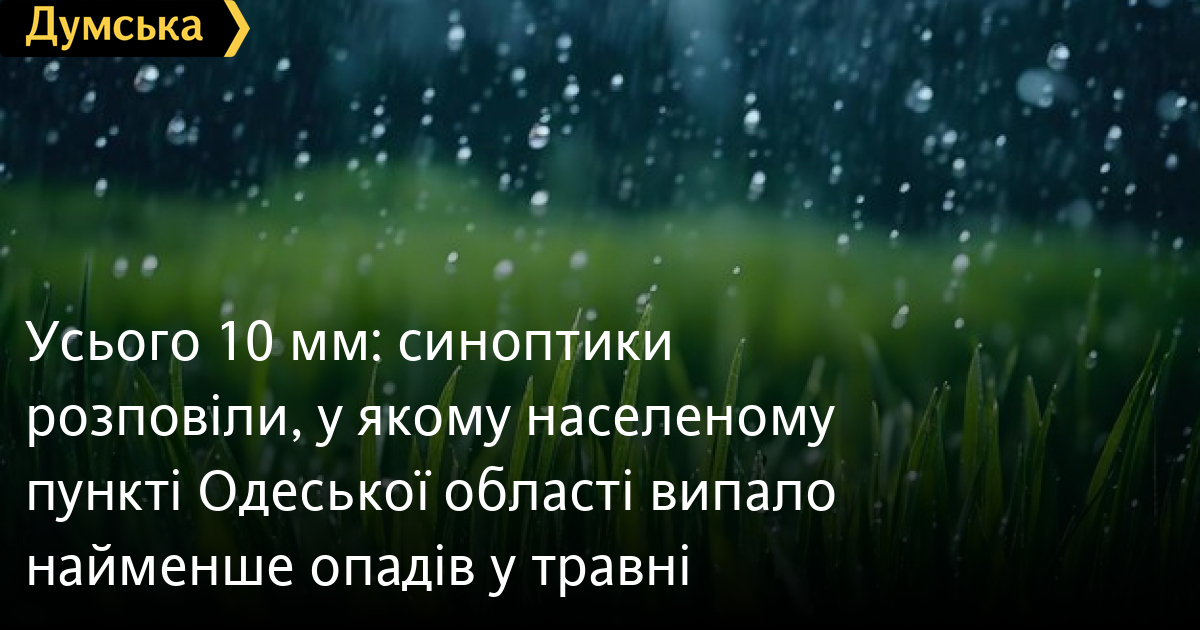 Усього 10 мм: синоптики розповіли, у якому населеному пункті Одеської області випало найменше опадів у травніНайменше опадів у травні випало в Ізмаїлі Одеської області — 10 мм, найбільше — 44 мм - у Затишші. Про це розповіли фахівці Гідрометцентру Чорного та Азовського морів. «У травні в регіоні переважала суха погода. Винятком стали останні п'ять діб, протягом яких і випала основна кількість опадів. Але до місячної норми ніде не дісталася. Майже у всіх районах області випало 60-80% від місячної норми опадів. А в Ізмаїлі та Любашівці — менш як 40 %», - розповіли метеорологи. Усього сума опадів по Одеській області за травень 2024 року: Затишшя — 44 мм; Сербка — 43 мм; Одеса — 34 мм; Роздільна — 34 мм; Білгород-Дністровський — 31 мм; Вилкове — 31 мм; Чорноморськ — 27 мм; Болград — 26 мм; Сарата — 24 мм; Южне — 20 мм; Любашівка — 19 мм; Ізмаїл — 10 мм. Середня багаторічна норма опадів травня для Одеси — 39 мм. Помітили помилку? Виділяйте слова з помилкою та натискайте control-enter Новини по цій темі: 7 листопада 2025: До +16, але з дощами: в Одесі прогнозують погіршення погоди 29 жовтня 2025: Котельні готові: Одеса увімкне опалення за два тижні, а початок листопада буде аномально теплим 6 жовтня 2025: Через погіршення погоди школи та садочки Одеської області переводять на дистанційне навчання 1 жовтня 2025: Катастрофа, яку можна було попередити (блог) |