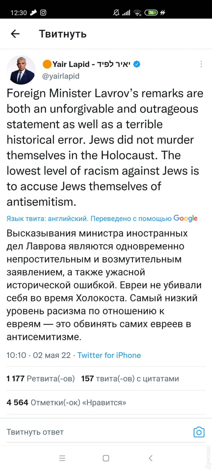 Израильский МИД требует от посла рф пояснений в связи с антисемитскими высказываниями ЛавроваПосла рф в Израиле вызывают «на ковер» в МИД этого государства. Представителя россии попросят объяснить высказывания министра иностранных дел страны-агрессора Сергея Лаврова о том, что у «Гитлера была еврейская кровь» и что «самые ярые антисемиты — это евреи», сообщает израильское издание Haaretz. Глава МИД рф Сергей Лавров, отвечая на вопрос, как обвинения в «нацификации» Украины сочетаются с тем, что у Президента Владимира Зеленского еврейские корни, выдвинул свою версию исторических событий и заявил, что евреи уничтожали сами себя. «Могу ошибиться, но у Гитлера тоже была еврейская кровь. Это совершенно ничего не значит. Мудрый еврейский народ говорит, что самые ярые антисемиты, как правило, евреи. В семье не без уродов», — заявил министр иностранных дел рф. На эту «интерпретацию» Холокоста мгновенно отреагировали в МИД Израиля. Глава министерства Яир Лапид в Твиттере назвал высказывания Лаврова «одновременно непростительными и возмутительными». «Евреи не убивали себя во время Холокоста. Самый низкий уровень расизма по отношению к евреям – это обвинять самих евреев в антисемитизме», – заявил Яир Лапид. Он добавил, что Израиль ожидает извинений. СМЕРТЬ РОСІЙСЬКИМ ОКУПАНТАМ! Помітили помилку? Виділяйте слова з помилкою та натискайте control-enter |
