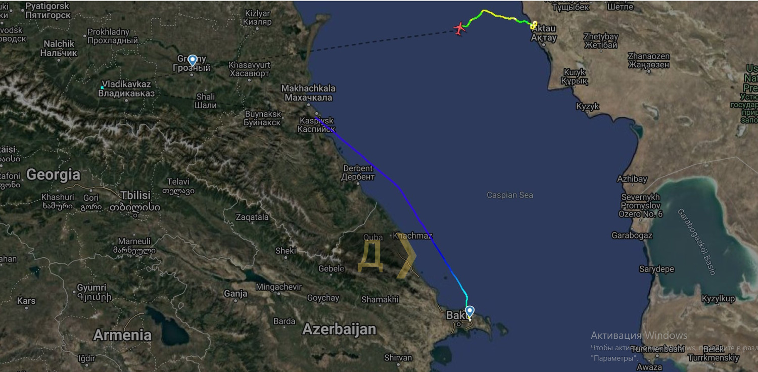 Десь тут - між Каспійськом, Грозним і Владикавказом літак обстріляли. Судячи з відео, на кілі «ембраєра» виявлено близько сотні отворів. Наразі важко зрозуміти, яку зброю застосовували — стрілецьку чи це вражаючі елементи зенітно-ракетного комплексу.