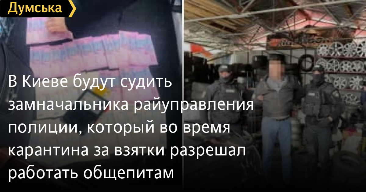 В Киеве будут судить замначальника райуправления полиции, который во время карантина за взятки разрешал работать общепитамЗаместитель начальника райуправления полиции в Киеве предстанет перед судом по подозрению в получении взятки за разрешение работать заведениям питания во время карантина. Как сообщает Киевская городская прокуратура, 38-летний чиновник систематически требовал и получал от руководителей заведений питания неправомерную выгоду. Он за деньги не привлекал их к ответственности и позволял работать во время карантинных ограничений. Следствие задокументировало получение полицейским 25 тыс. гривен от руководителей заведений питания. Он был задержан с поличным в конце апреля при получении очередной взятки в размере 13 тыс. гривен. Действия правоохранителя квалифицированы по ч. 3 ст. 368 (получение неправомерной выгоды) и ч. 5 ст. 27, ч. 1 ст. 325 (соучастие в нарушении санитарных норм) УК Украины. Санкции статей предусматривают наказание в виде лишения свободы от пяти до десяти лет с лишением права занимать определенные должности или заниматься определенной деятельностью сроком до трех лет с конфискацией имущества. СМЕРТЬ РОССИЙСКИМ ОККУПАНТАМ! Заметили ошибку? Выделяйте слова с ошибкой и нажимайте control-enter Новости по этой теме: 4 марта 2023: "Вакцини-довгожителі", або Як щеплення проти COVID-19 перетворилися в Україні на небезпечний ритуал 27 января 2023: МОЗ обязали опубликовать договоры на закупку вакцин против COVID-19: апелляционный суд удовлетворил иск журналиста "Думской" 11 января 2023: За неделю в Одессе зафиксировано 159 случаев ковида 4 января 2023: За неделю в Одессе зарегистрировано 113 случаев ковида |