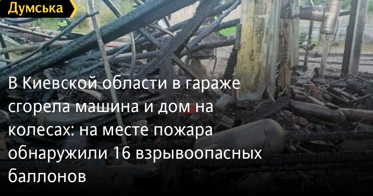 В Киевской области в гараже сгорела машина и дом на колесах: на месте пожара обнаружили 16 взрывоопасных баллоновПожар в гараже ликвидировали спасатели на территории села Горенка Гостомельской ОТГ Киевской области вечером 8 сентября. Как сообщает пресс-служба областной ГСЧС, огнем было охвачено помещение площадью 60 кв.м с домом на колесах и машиной Audi внутри. Во время тушения спасатели обнаружили одиннадцать баллонов с фреоном, четыре кислородных и один газовый. Удалось избежать распространения огня на соседний дом и гараж. Причина ЧП устанавливается. СМЕРТЬ РОССИЙСКИМ ОККУПАНТАМ! Заметили ошибку? Выделяйте слова с ошибкой и нажимайте control-enter |