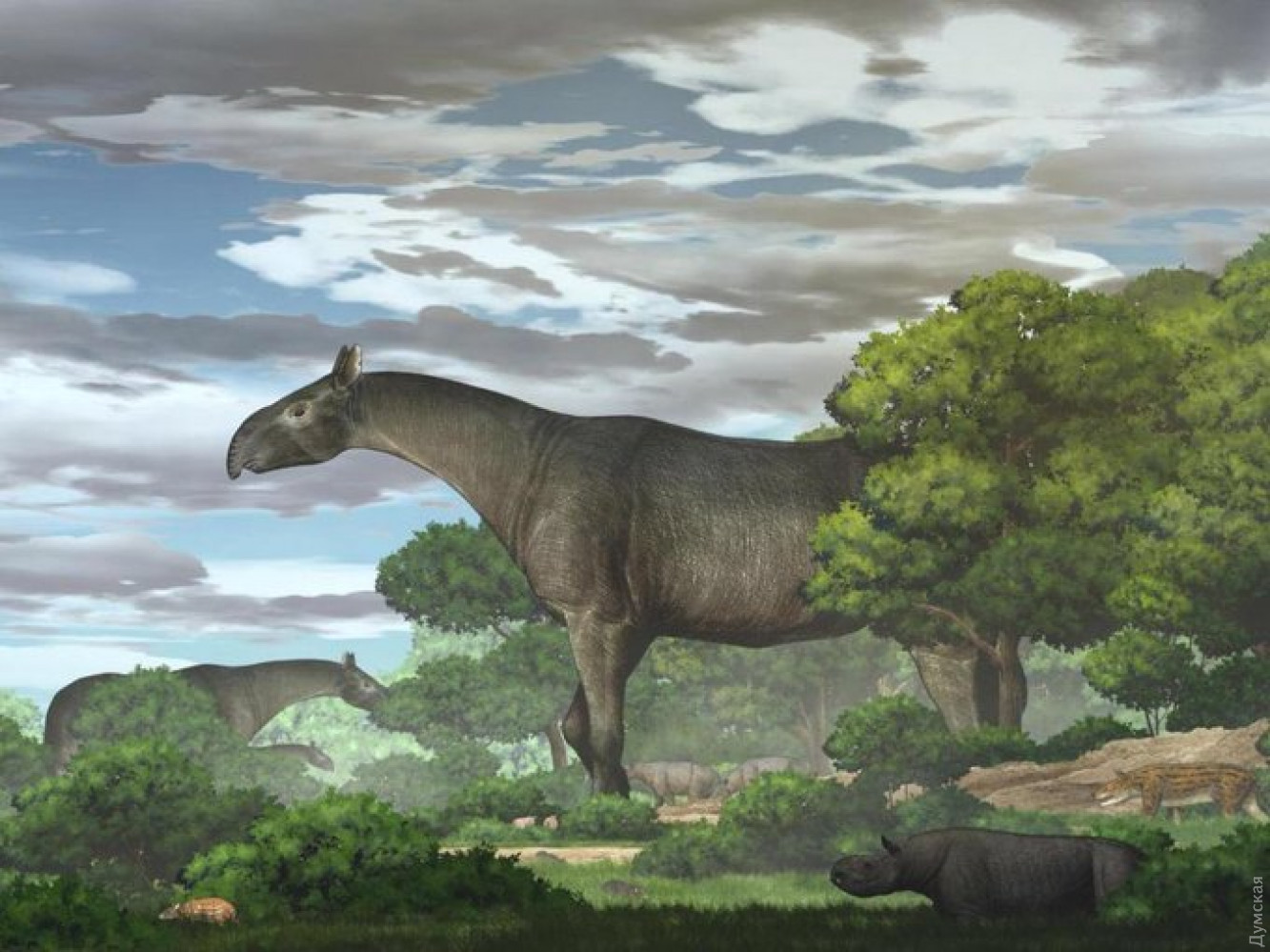Останки гигантского безрогого носорога были найдены на северо-западе Китая. Об этом сообщает французское издание Sciences et Avenir. Гигантские носороги — самые крупные наземные млекопитающие, которые когда-либо жили. Их размеры — до пяти метров в высоту, семь метров в длину, а вес более 15 тонн. Они жили от 37 до 23 миллионов лет назад, и большинство найденных образцов происходят из Азии, в частности из Китая, Монголии, Казахстана и Пакистана. Группа из Китайской академии обнаружила почти нетронутую окаменелость нового вида гигантского носорога в бассейне Линься в провинции Ганьсу на северо-западе Китая. Подробно животное описано в журнале Communications Biology. Ученые назвали находку Paraceratherium linxiaense. Это животное имеет особенности, отличные от других известных до сих пор гигантских носорогов. В частности, у него тонкий череп с носом, похожим на нос тапира, с более глубокими носовыми полостями, чем у других видов. Череп, нижняя челюсть и позвонок, прикрепленный к черепу, и еще два позвонка — единственные найденные элементы, поэтому трудно оценить размеры этого нового носорога, который, как и другие, и, несмотря на свое название, не имел рога на носу — он появился у носорогов намного позже. По словам исследователей, найденное животное было больше, чем самые большие звери этого рода. Открытие нового экземпляра позволило проследить историю Paraceratherium. По словам авторов исследования, это группа тесно связана с Aralotherium — другим родом гигантских носорогов. Шесть видов Paraceratherium составляют монофилетическую группу, которая в олигоцене распространилась по Центральной и Южной Азии, в том числе по региону Тибета, который в то время был не таким высоким, как в настоящее время. Они жили в редких влажных или засушливых лесах и питались листьями и ветвями. СМЕРТЬ РОССИЙСКИМ ОККУПАНТАМ! Заметили ошибку? Выделяйте слова с ошибкой и нажимайте control-enter |