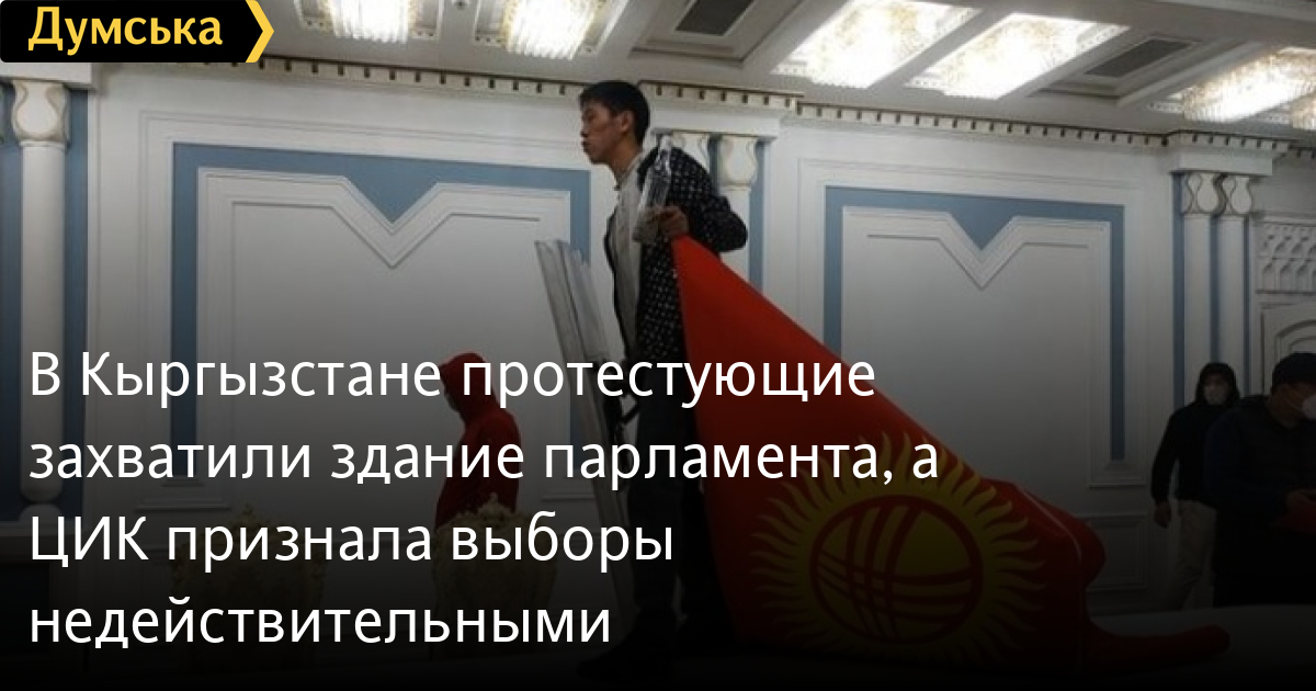 В Кыргызстане протестующие захватили здание парламента, а ЦИК признала выборы недействительнымиВ ночь на 6 октября в Кыргызстане вспыхнули акции протеста из-за недовольства результатами выборов в стране, которые состоялись 4 октября. В столице страны Бишкеке тысячи людей вышли на митинг, но силовики оттеснили демонстрантов от правительственных зданий, задействовав слезоточивый газ, резиновые пули, светошумовые гранаты и водометы. В ходе столкновений пострадали порядка 20 человек. Несмотря на сопротивление правоохранителей протестующим удалось ночью протаранить машиной ворота возле парламента в столице и ворваться в здание. Людям удалось добраться до седьмого этажа, где расположен кабинеты президента, спикера и лидеров парламентских фракций. Но в это время никого из них не было в здании. Сегодня утром стало известно, что Центральная избирательная комиссия Кыргызстана признала недействительными итоги парламентских выборов, которые и вызвали волну протестов. «В целях недопущения напряжения обстановки в стране принято такое решение. Из присутствующих на заседании 11 членов ЦИК все единогласно поддержали предложение», — отметила глава ЦИК Нуржан Шайлдабекова. СМЕРТЬ РОССИЙСКИМ ОККУПАНТАМ! Заметили ошибку? Выделяйте слова с ошибкой и нажимайте control-enter |