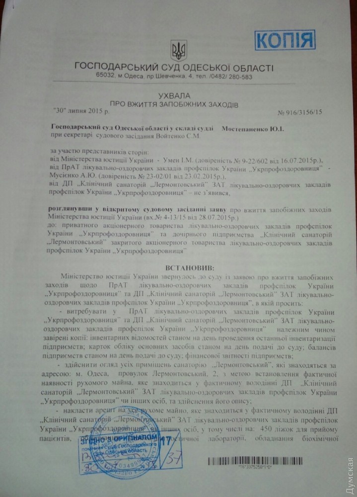 В Лермонтовском санатории «исполнители» выгоняли пациентов из палат, чтобы провести инвентаризациюСегодня в санаторий «Лермонтовский» нагрянули 20 человек, назвавшихся сотрудниками исполнительной службы. Они пытались провести опись имущества. Визитеры сообщили, что действуют согласно определения хозяйственного суда области по заявлению Минюста об обеспечении иска. При этом некоторые «гости» не представились, другие же предоставили удостоверения исполнительной службы, однако документы оказались просроченными. «Эти люди выгнали врачей и пациентов из палат и пытались провести инвентаризацию»,- рассказал «Думской» директор санатория Дмитрий Антипов. Исполнители уже начали опись, однако их спугнули прибывшие на место журналисты и представители «Самообороны Евромайдана». По словам координатора «Самообороны Евромайдана» Виталия Кожухаря, они получили сигнал о попытке рейдерского захвата санатория и приехали, чтобы прояснить ситуацию. После появления евромайдановцев исполнители исчезли. Отметим, это далеко не первая попытка захватить здравницу. Общественности всякий раз удавалось отстоять ее. В настоящее время санаторий работает в обычном режиме. Судебное разбирательство назначено на завтра, 3 сентября. СМЕРТЬ РОСІЙСЬКИМ ОКУПАНТАМ! Помітили помилку? Виділяйте слова з помилкою та натискайте control-enter |
