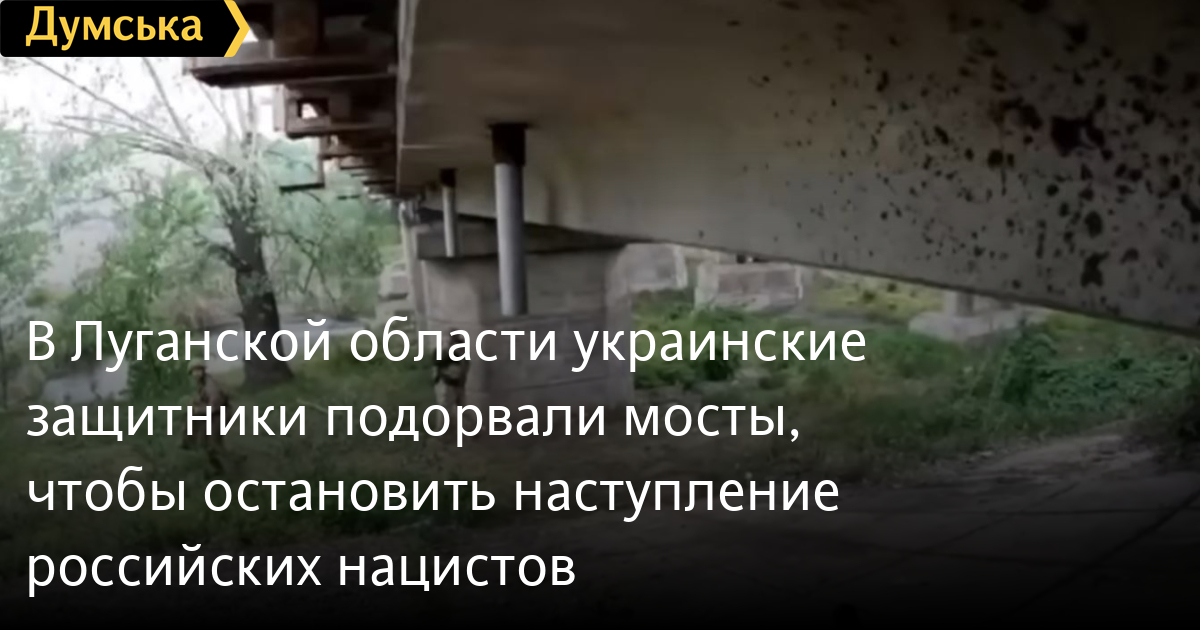 В Луганской области украинские защитники подорвали мосты, чтобы остановить наступление российских нацистовСтратегически важные мосты в Луганской области подорвали украинские защитники, чтобы остановить наступление российских оккупантов на Северодонецк и Лисичанск. Соответствующее видео обнародовала Бригада быстрого реагирования Нацгвардии. Спецоперацию проводили нацгвардецы совместно со спецназом ССО и СБУ. Мосты подорваны на ключевом направлении от Рубежного. СМЕРТЬ РОССИЙСКИМ ОККУПАНТАМ! Заметили ошибку? Выделяйте слова с ошибкой и нажимайте control-enter |