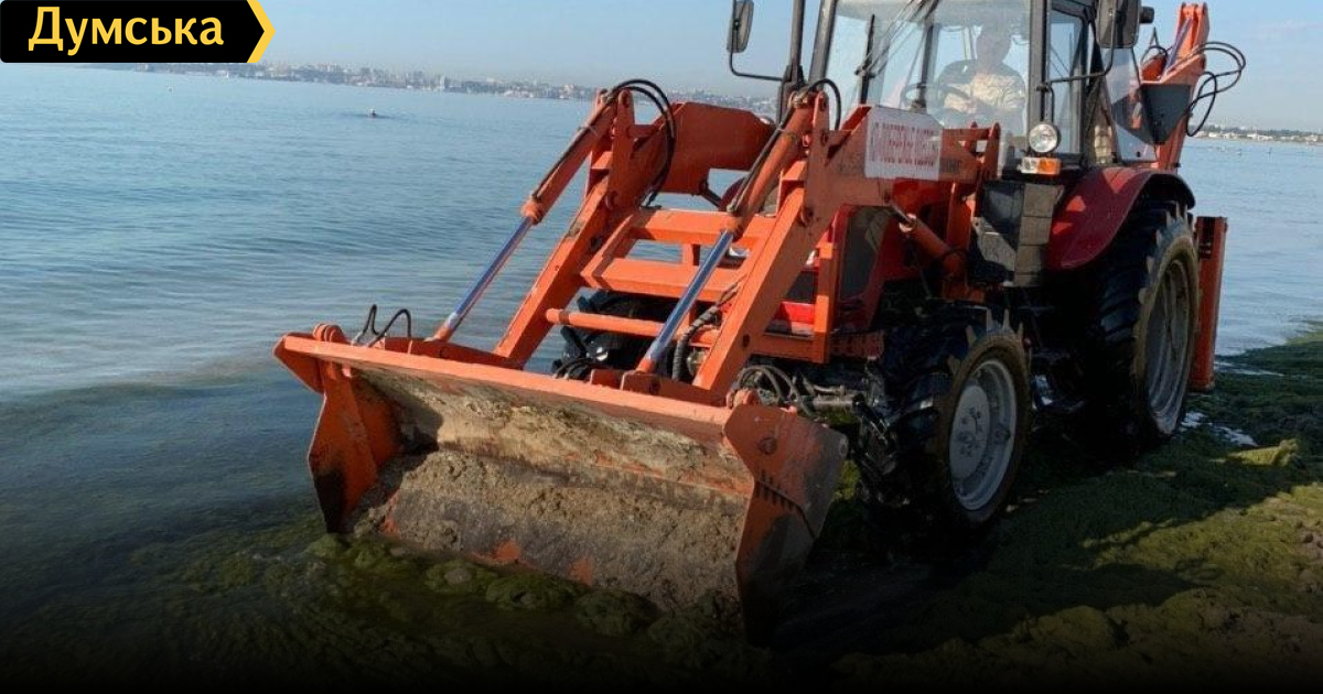 Коммунальщики с лопатами и трактор 2 июня провели уборку прибрежной линии на пляже в Лузановке и вывезли более 30 кубометров водорослей.