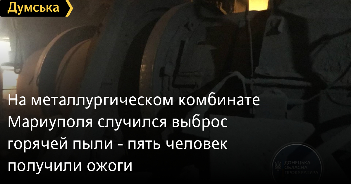На металлургическом комбинате Мариуполя случился выброс горячей пыли — пять человек получили ожогиАвария с пятью пострадавшими произошла на металлургическом комбинате частного акционерного общества «ММК имени Ильича». Как сообщает прокуратура в Донецкой области, на аглофабрике во время ремонта оборудования случился выброс горячей пыли из агломератной машины. Замначальника цеха, старший мастер, мастер и двое электромонтеров, которые находились поблизости, получили термические ожоги разной степени тяжести. Пострадавших рабочих возрастом от 38 до 48 лет госпитализировали в ожоговое отделение горбольницы. Проводятся первоочередные следственные действия. Обстоятельства устанавливаются, опрашиваются очевидцы. Инициировано досудебное расследование. СМЕРТЬ РОССИЙСКИМ ОККУПАНТАМ! Заметили ошибку? Выделяйте слова с ошибкой и нажимайте control-enter Новости по этой теме: 12 января 2022: Харьковские станции метро ожидает масштабная проверка: в вестибюле подземки на площади Конституции рухнул потолок (фото) 8 января 2022: В Одессе из офиса фирмы выкрали сейф с внушительной суммой денег, золотом и пистолетом 27 декабря 2021: В лесополосе под Киевом нашли тело главврача из Ровенской области: по подозрению в убийстве задержаны таксист с приятелем 23 декабря 2021: В Киеве задержали подозреваемых мошенников, которые обманывали на свиданиях мужчин ради денег |