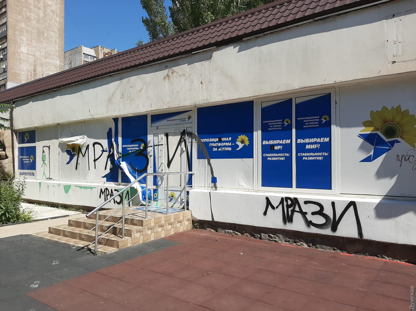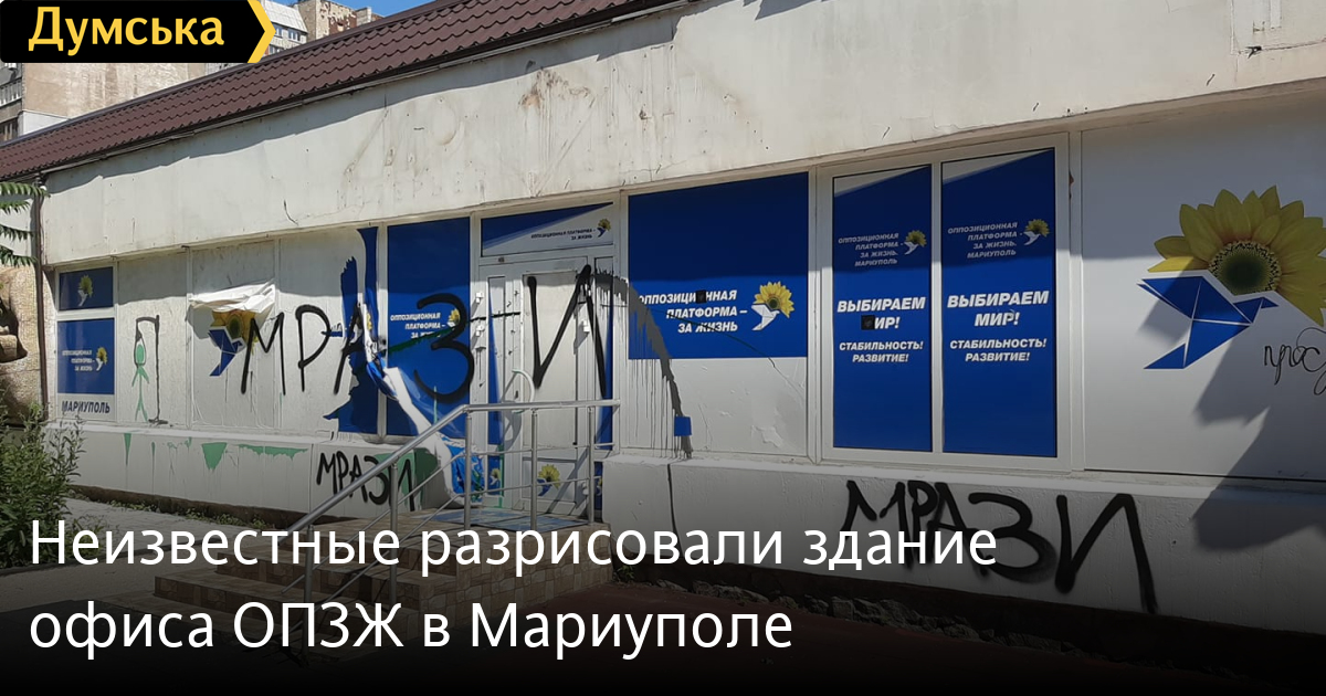 Неизвестные разрисовали фасад здания офиса партии ОПЗЖ в Мариуполе Донецкой области. Об этом сообщил в Фейсбук журналист, историк, автор книги «Дело Василия Стуса» Вахтанг Кипиани. «Так выглядит офис партии Медведчука в Мариуполе», — подписал он фотографию. На фото видно, что плакаты с партийной символикой сорвали, изобразили повешенного человечка, на стенах написали «мрази». Отметим, что одному из лидеров ОПЗЖ, нардепу Виктору Медведчуку было объявлено о подозрении в госизмене. Также ему вменяют разграбление национальных ресурсов в аннексированном Крыму. Политика отправили под круглосуточный домашний арест. Также в государственной измене обвиняют еще одного члена ОПЗЖ Тараса Козака. Ранее Виктор Медведчук отметил, что его соратник якобы находится на лечении в Беларуси, но официального подтверждения этому нет. СМЕРТЬ РОССИЙСКИМ ОККУПАНТАМ! Заметили ошибку? Выделяйте слова с ошибкой и нажимайте control-enter Новости по этой теме: 29 января 2022: Провокация: в Одессе "минер" горсовета требовал, чтобы Труханов извинился перед Дмитруком 12 января 2022: Харьковские станции метро ожидает масштабная проверка: в вестибюле подземки на площади Конституции рухнул потолок (фото) |