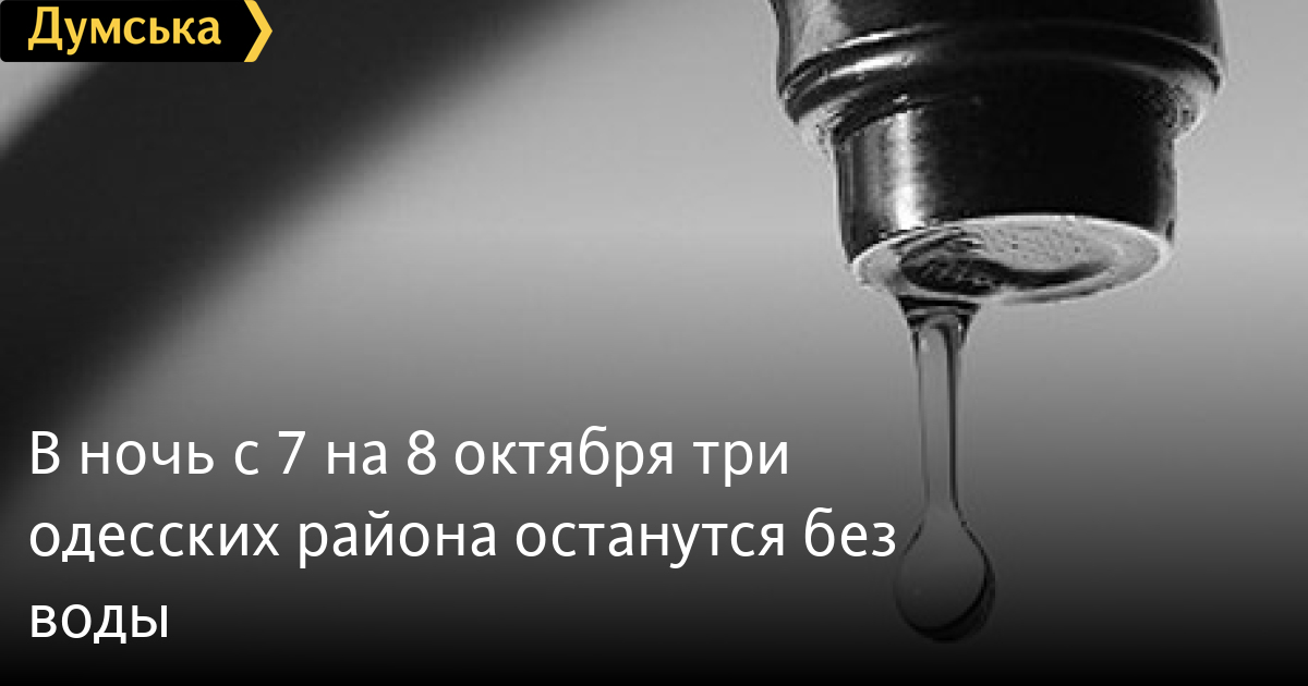 В связи с проведением аварийно-ремонтных работ на водопроводных сетях в ночь с 7 на 8 октября три района Одессы останутся без воды. Как сообщила пресс-служба горсовета со ссылкой на «Инфоксводоканал», подача воды будет прекращена с 23:30 7 октября до 06:00 8 октября в Киевском, Малиновском, Приморском районах и поселке Мизикевича. СМЕРТЬ РОССИЙСКИМ ОККУПАНТАМ! Заметили ошибку? Выделяйте слова с ошибкой и нажимайте control-enter |