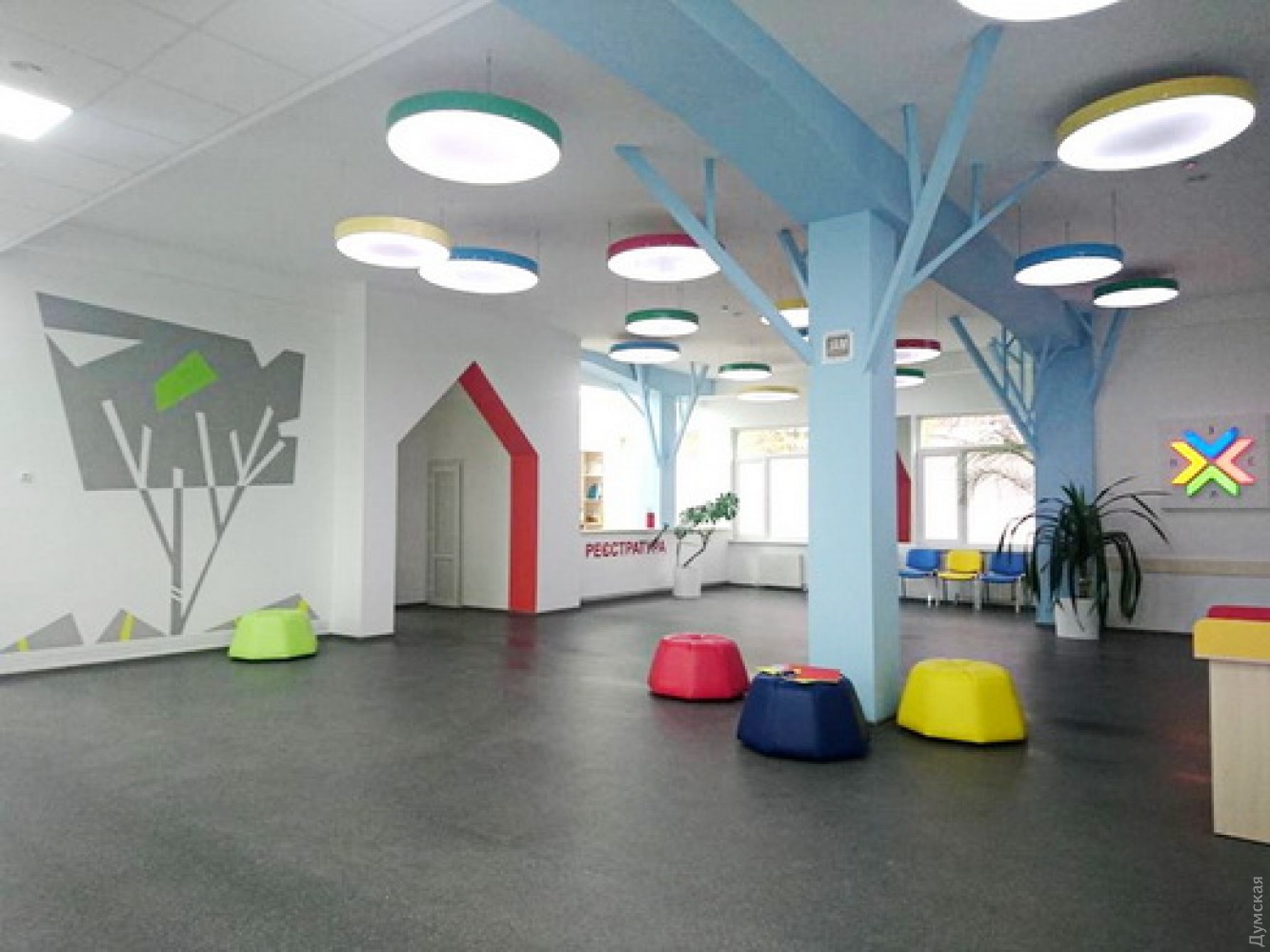 В Одессе практически завершен капитальный ремонт отделения детской городской поликлиники №6 на улице Академика Филатова. Как сообщает пресс-служба горсовета, в учреждении заменили все коммуникации, помещения капитально отремонтированы, а особое внимание уделено дизайну. Несущие колонны в холле стилизованы под деревья, на потолке размещены оригинальные светильники, так что у маленьких пациентов создается впечатление, что они попали в волшебный лес.