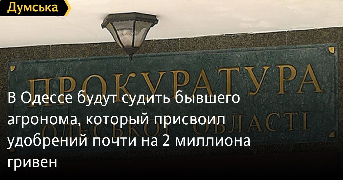 В Одессе будут судить бывшего агронома, который присвоил удобрений почти на 2 миллиона гривенСледствие направило в суд обвинительный акт в отношении бывшего агронома-энтомолога одного из подразделений Одесской государственной сельскохозяйственной научной станции Национальной академии аграрных наук Украины. Как сообщили в прокуратуре, агронома подозревают в присвоении переданных ему в 2018 году для сельскохозяйственной деятельности удобрений стоимостью более 1,9 млн грн. Действия подсудимого квалифицировали по ч.5 ст.191 УК Украины (присвоение, растрата имущества путем злоупотребления служебным положением). Ему грозит от 7 до 12 лет тюрьмы с конфискацией имущества. СМЕРТЬ РОССИЙСКИМ ОККУПАНТАМ! Заметили ошибку? Выделяйте слова с ошибкой и нажимайте control-enter |