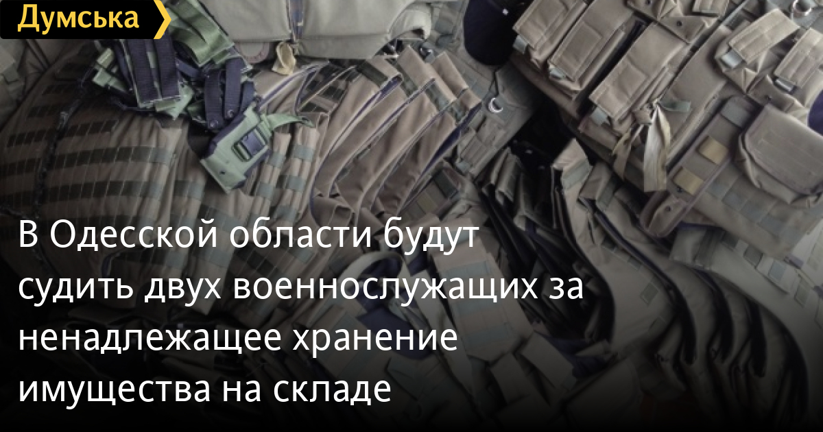В Одесской области будут судить двух военнослужащих за ненадлежащее хранение имущества на складеНачальник вещевой и продовольственной службы тыла и бывший начальник вещевого склада воинской части в Одесской области предстанут перед судом по подозрению в ненадлежащем хранении имущества. В специализированной прокуратуре в военной и оборонной сфере Южного региона сообщили, что обвинительный акт в отношении военнослужащих направлен в суд. Их действия квалифицировали по ч.3 ст.425 УК Украины (халатное отношение к военной службе). Подсудимым грозит от 5 до 7 лет тюрьмы. По данным следствия, фигуранты не обеспечили учет и надлежащее хранение бронежилетов, кевларовых шлемов, рюкзаков и другого военного имущества, что нанесло урон государству на более 716 тысяч гривен. СМЕРТЬ РОССИЙСКИМ ОККУПАНТАМ! Заметили ошибку? Выделяйте слова с ошибкой и нажимайте control-enter |
