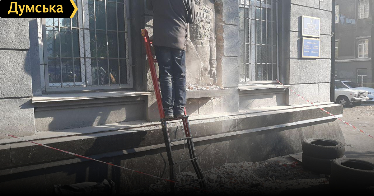 Как передает корреспондент «Думской», работы по демонтажу проводят представители общественной организации «Національний спротив». Они предъявили журналистам документ, выданный начальником квартирно-эксплуатационного отдела Министерства обороны Украины, в котором говорится, что отдел не возражает против демонтажа памятного знака, который подпадает под закон о декоммунизации, силами и средствами указанной общественной организации и предлагает передать барельеф после демонтажа в надлежащем виде в хранилище музея Южного оперативного командования.