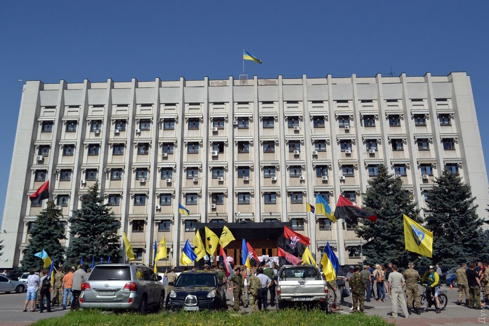 Перед сегодняшней сессией облсовета возле здания ОГА собралось более сотни добровольцев и активистов патриотических организаций.