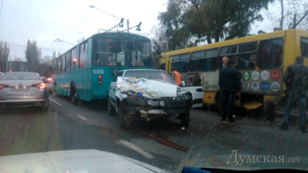 Авария с участием троллейбуса, маршрутки и легкового автомобиля произошла утром 25 октября на Люстдорфской дороге, в районе площади Толбухина. Как сообщают очевидцы, автомобиль ВАЗ-2109 на большой скорости врезался в остановившийся троллейбус, после чего его откинуло на маршрутку. По предварительным данным, в результате ДТП никто не пострадал. Сильнее всего поврежден ВАЗ, у которого полностью разбита передняя часть кузова. Из-за аварии движение транспорта в районе площади некоторое время было затруднено. СМЕРТЬ РОСІЙСЬКИМ ОКУПАНТАМ! Помітили помилку? Виділяйте слова з помилкою та натискайте control-enter |