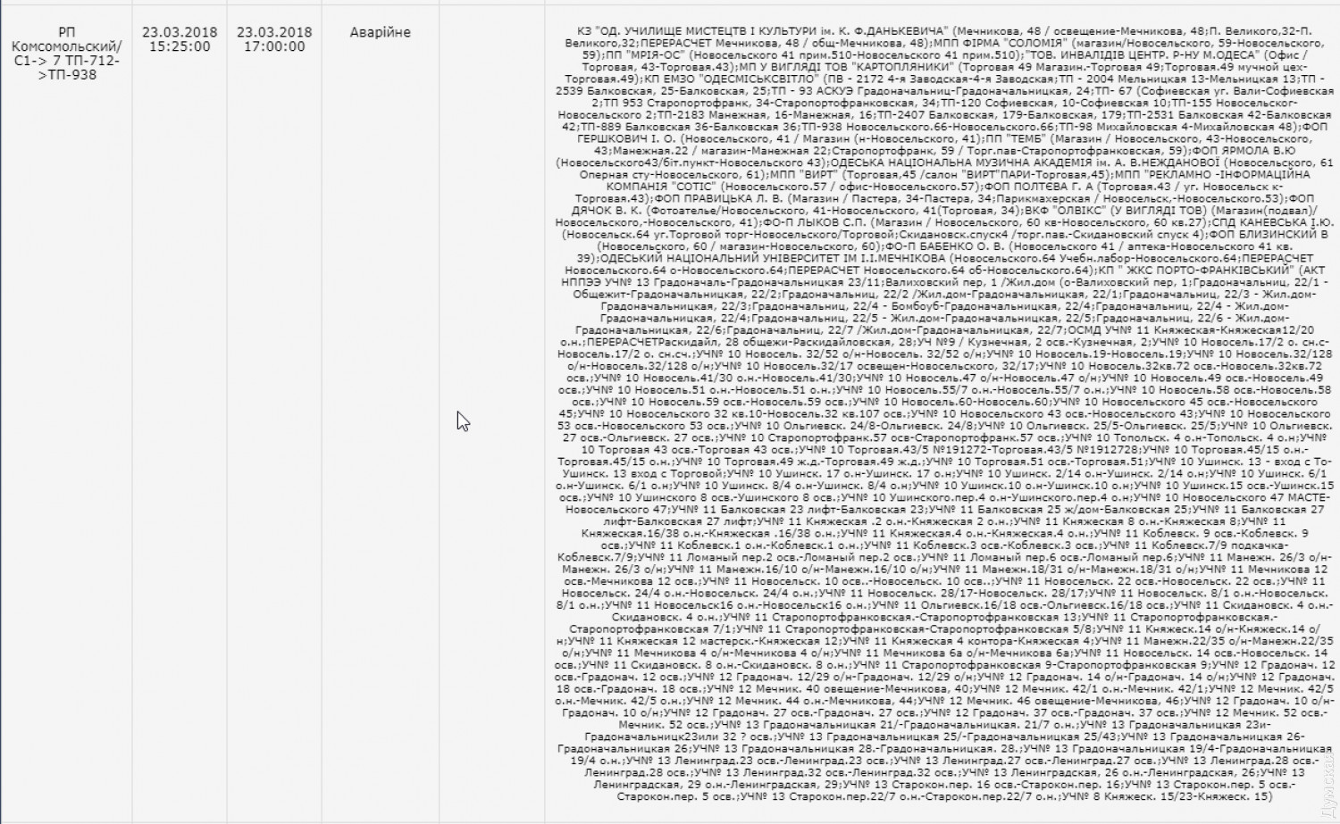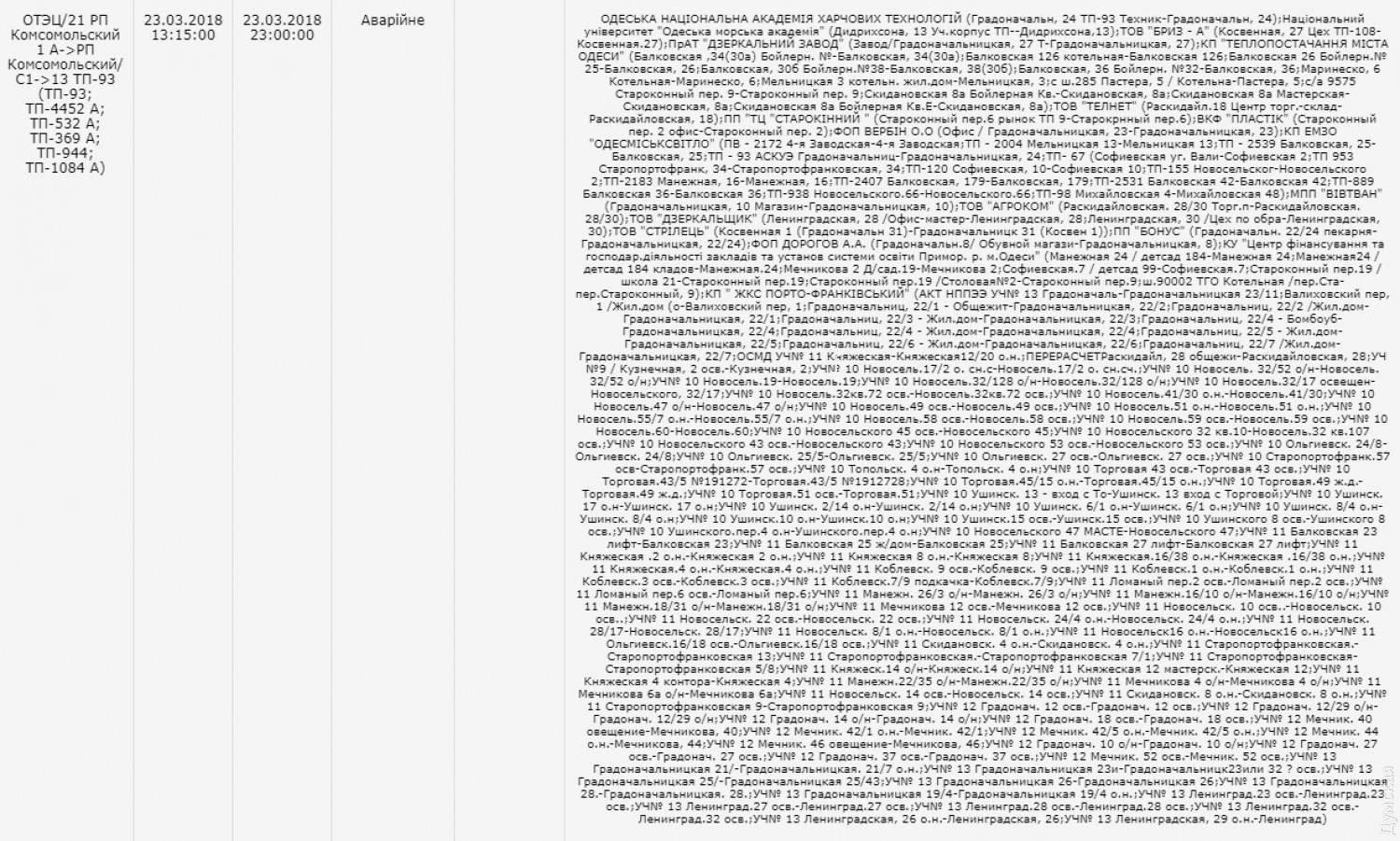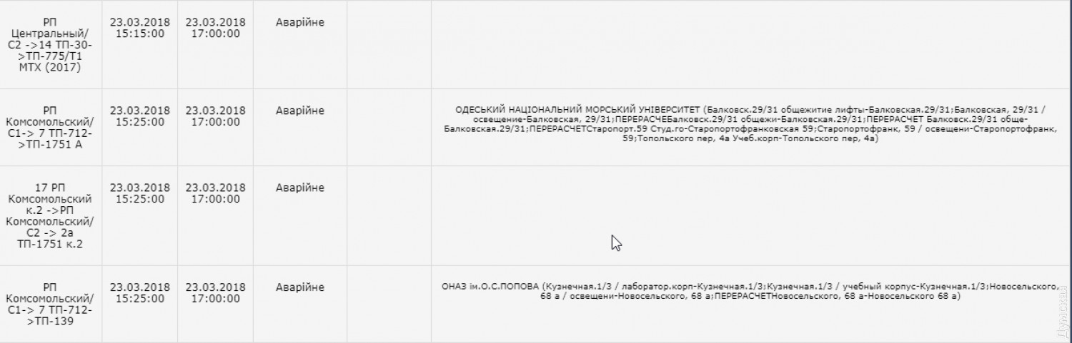 Из-за аварии на подстанции десятки домов в центре Одессы и на Молдаванке остались без светаАвария на распределительной подстанции «Комсомольская» оставила без света часть Молдаванки и центра города. В частности, электроэнергии нет на улице Осипова, Кузнечной, частично обесточена улица Мечникова, Балковская, Градоначальницкая, Софиевская, Ольгиевская, Новосельского, Старопортофранковская, Староконный переулок, Княжеская, Коблевская, Валиховский переулок, Раскидайловская, спуск Маринеско. Без света остались десятки предприятий и учреждений, например офис ПАО «Одессагаз». На сайте «Облэнерго» значится, что электричество должны включить в 23 часа. Полный список обесточенных адресов можно посмотреть здесь. СМЕРТЬ РОСІЙСЬКИМ ОКУПАНТАМ! Помітили помилку? Виділяйте слова з помилкою та натискайте control-enter |