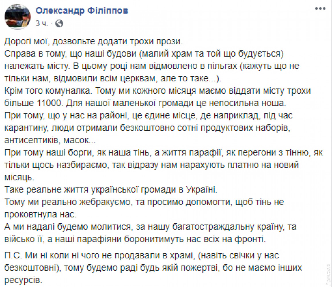 Свято-Покровский храм Православной церкви Украины, что на улице Курской, 67, находится на грани выживания. Город не продлил церковникам льготные условия аренды помещения и теперь они должны платить по 11 тысяч гривен в месяц. Как рассказал «Думской» настоятель Свято-Покровского храма протоиерей Александр Филиппов, сооружения храма находятся в собственности департамента коммунальной собственности Одесского горсовета и в этом году горсовет не продлил льготную арендную плату, а полную аренду в размере 11 тысяч гривен приход платить не может.
