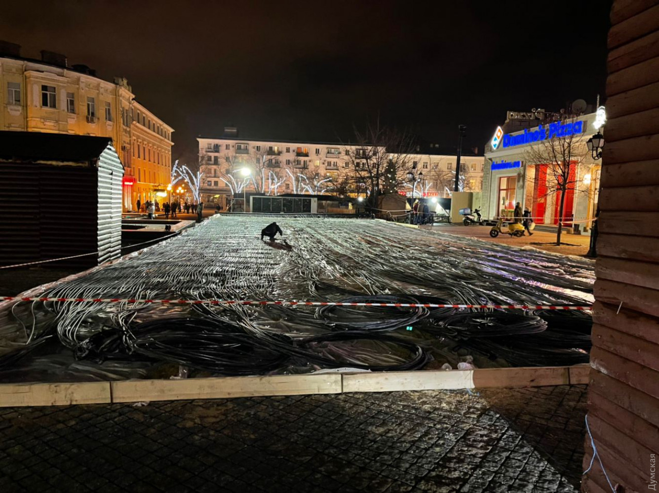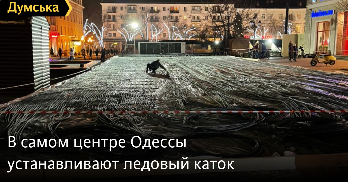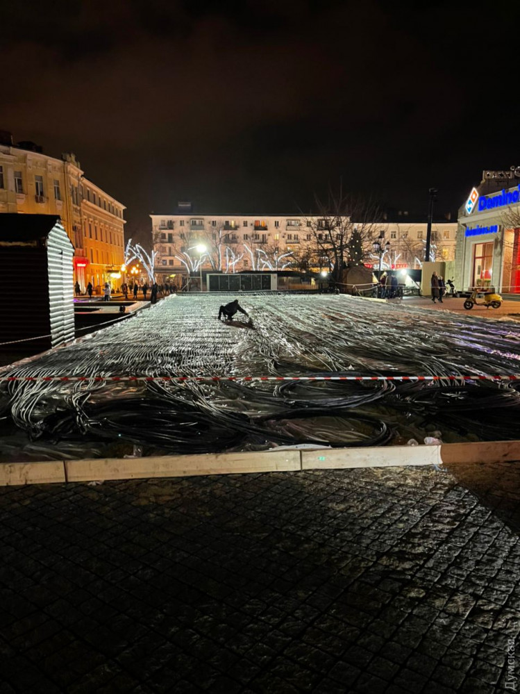 Ледовый каток начали монтировать на Греческой площади Одессы сегодня вечером. Рабочие уже установили оборудование и проложили сети, передает корреспондент «Думской».