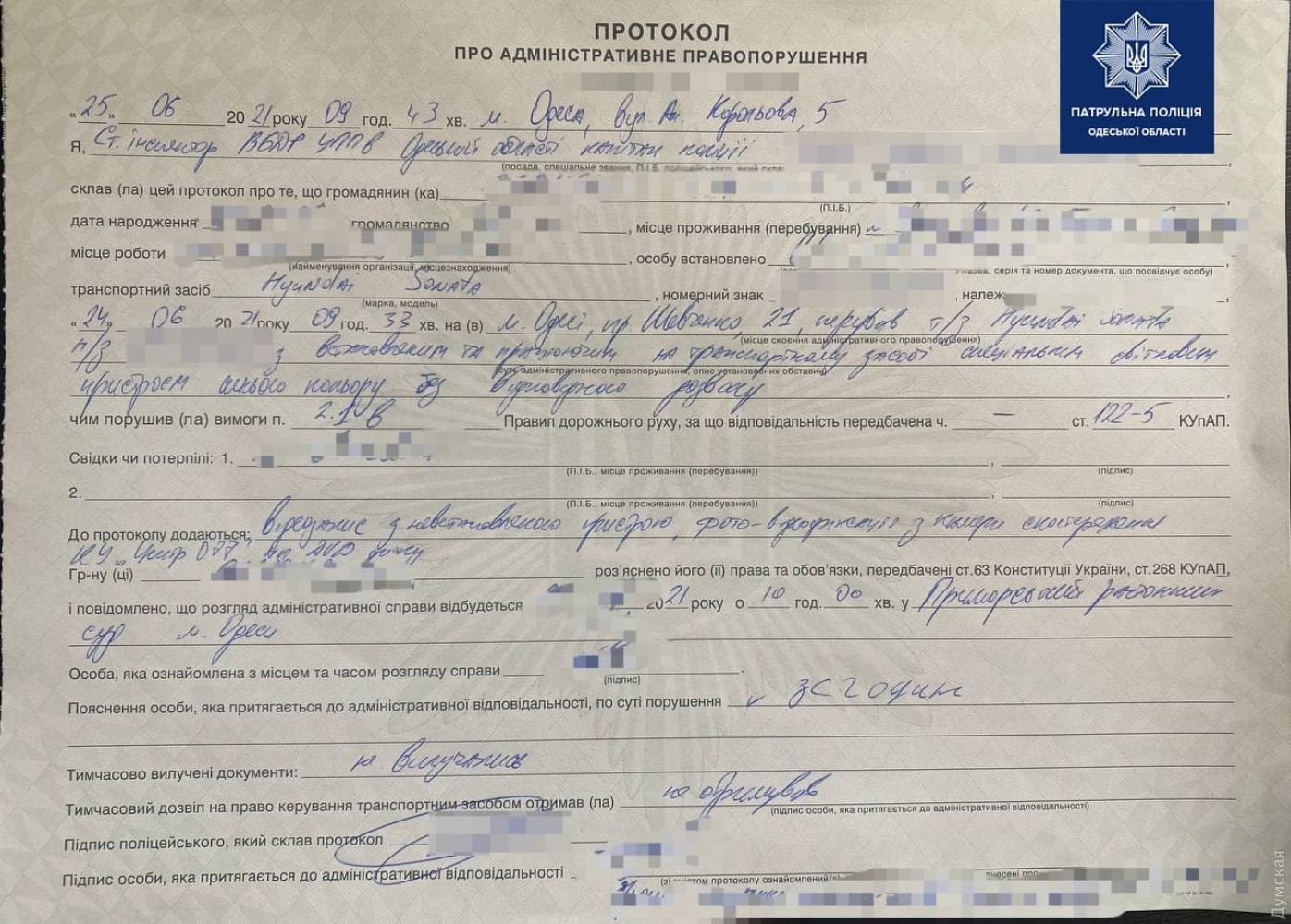 Мужчину пригласили в отделение полиции, где ему выписали протокол по ст.122-5 (нарушение требований законодательства об установке и использовании световых или звуковых сигналов) КУоАП.