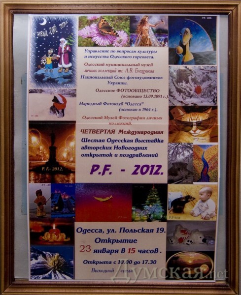 В Одессе прошла очередная, уже шестая одесская выставка авторских новогодних открыток фото-поздравлений «P.F.». В этом году в экспозиции приняли участие 125 авторов из 28 стран ближнего и дальнего зарубежья. На выставке представлено 212 работ из Украины, России, Беларуси, Литвы, Израиля, Германии, Италии, Грузии, Сирии, Нигерии, Чехии, Болгарии, Китая, Канады, Узбекистана, Кубы, Монголии, Дании, Франции, США и многих других стран. Работы выполнены в технике фотографии, живописи, графики, коллажа, росписи по стеклу, вышивке. В рамках открытия выставки прошёл конкурс работ в номинации «Приз зрительских симпатий». Победителем стал одессит Александр Синельников. СМЕРТЬ РОСІЙСЬКИМ ОКУПАНТАМ! Помітили помилку? Виділяйте слова з помилкою та натискайте control-enter |