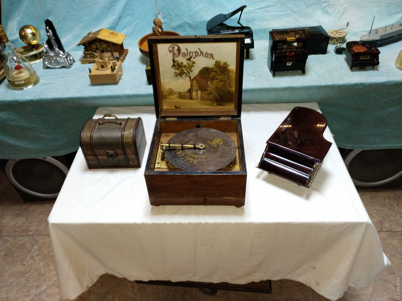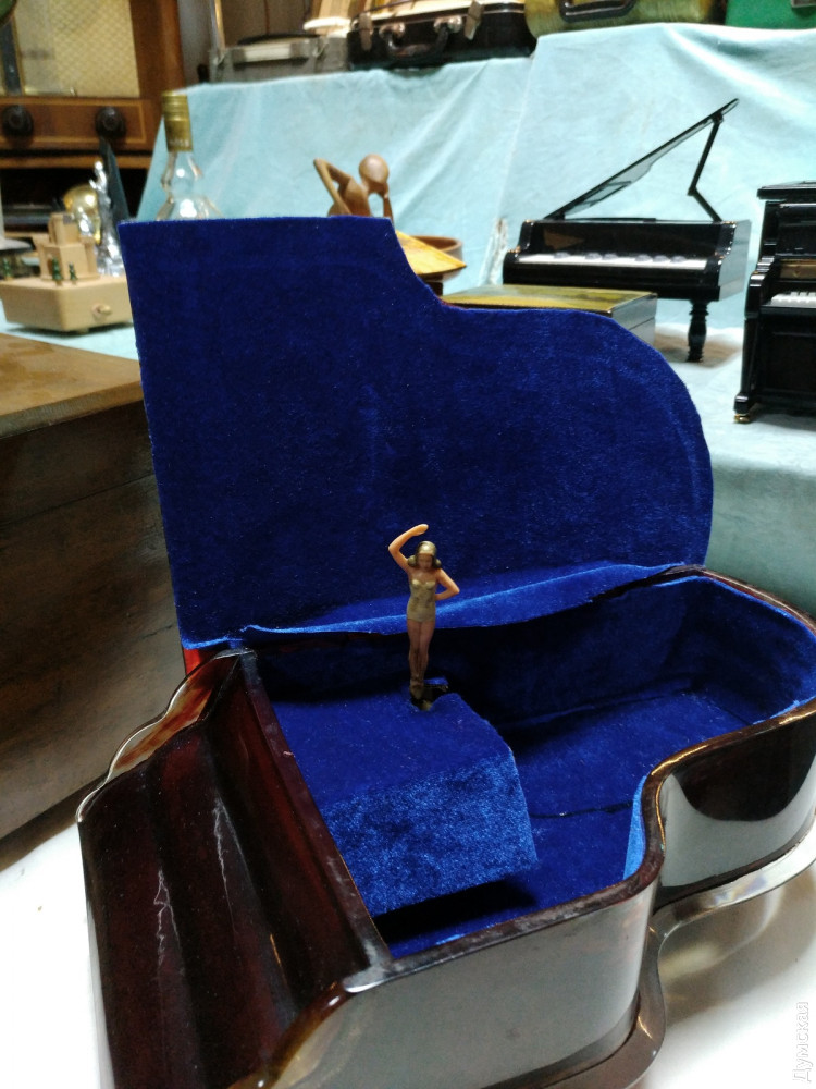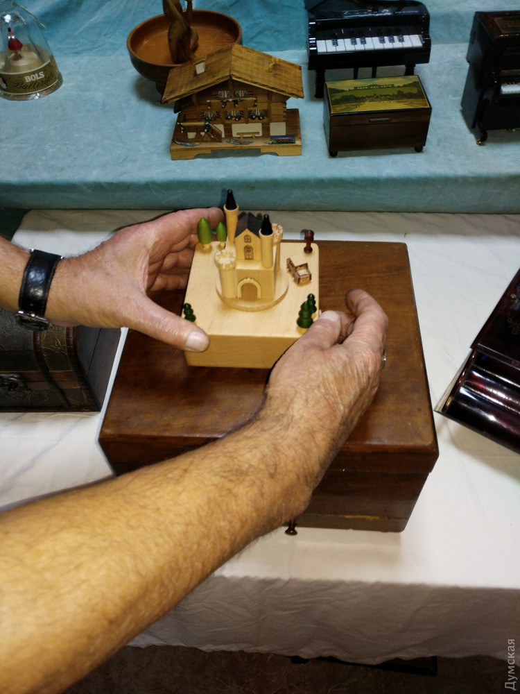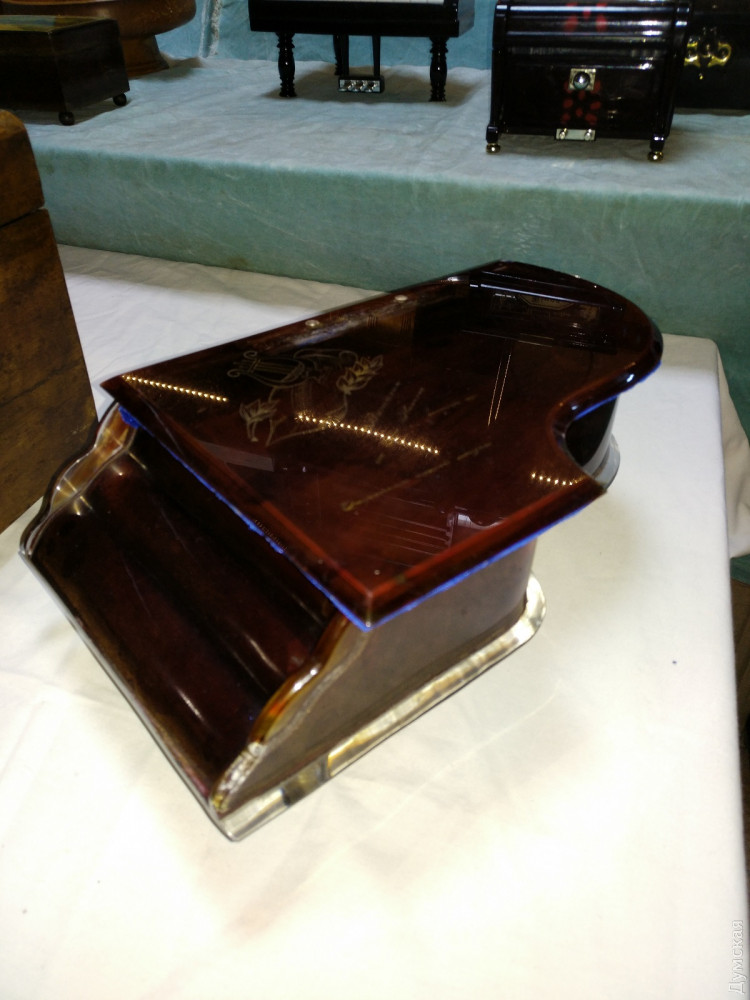 В одесском Музее звука открылась первая в нашем городе выставка музыкальных шкатулок. На ней представлены 22 экспоната, каждый из которых имеет свою историю. Корреспондент «Думской» Надежда Маркевич побывала на выставке и узнала много интересного о самом вожделенном подарке 1950-х годов и убедилась,что мода на музыкальные шкатулки снова возвращается. И без того умиротворенная атмосфера в Музее звука, теперь стала еще более медитативной. Мелодии, звучащие из этих утонченных изделий, способны ввести в нирвану любого. Изобретателем музыкальной шкатулки называют француза Антуана Фавра, который изготовил этот искусный механизм в далеком 1796 году. Он представляет собой вращающийся валик с иголочками, расположенными в определенном порядке, которые, цепляясь за зубцы металлического гребня, издают звук. Шкатулки были очень популярны в XIX и начале XX веков, до того времени, пока не появился граммофон. Действующая выставка – своего рода путешествие в прошлое! Два десятка артефактов родом из Германии, Израиля, Бельгии, Испании, Франции и конечно СССР, их собирали по аукционам и блошиным рынкам. Самый почтенный экспонат выставки, с которого и началась коллекция — 150-летний немецкий полифон. Директор музея Василий Пинчук случайно заметил ее на одном из аукционов и приобрел за триста с лишним долларов. Но жизнь шкатулки оказалась короткой – кто-то из посетителей музея резко рванул и сломал ключ для завода. Починить ее у сотрудников музея пока что не получается. «Я очень надеюсь, что найдется толковый токарь-фрезеровщик, который сможет нам помочь и шкатулочка снова запоет», — говорит заместитель директора музея Александр Власов. К сожалению, предыдущая история этого раритета неизвестна. Появление нового экспоната в музее стало толчком к поиску других шкатулок и расширению коллекции. Первой «подружкой» немецкого полифона стало изделие из Швейцарии 50-х годов в виде домика. Потом появилась копия шкатулки, в которой хранил свои перстни сам Наполеон Бонапарт. Под звуки классики в ней танцевала изящная балерина. Среди необычных экспонатов также шкатулка в виде пещеры, в которой стоит Дева Мария с младенцем. Такие изделия, говорит Александр Власов, дарили друг другу на Рождество. Есть в коллекции и специальная помолвочная шкатулка, которую дарили вместе с колечком, когда просили руки и сердца, а есть непосредственно свадебная — с танцующей парой внутри. Есть музыкальный ящик, который служил хранилищем для сигарет, а есть шкатулка-реклама французского напитка с золотой пылью внутри. Однако коллекция была бы не полной без творений современного Китая. Изделия из Поднебесной, хоть и сделаны из пластика, но притягивают взгляд посетителей не меньше, чем раритеты. Одна из них сделана в виде рояля, другая – по образу и подобию Титаника. Главное их отличие — отсутствие механики. Здесь музыка воспроизводится уже с помощью электроники. «Эти шкатулки мы приобрели после того как некоторые юные посетители стали задавать нам вопрос о наличии в шкатулке входа usb. Это уже такая современная деформация. Как оказалось, такое чудо техники действительно существует», — улыбается Александр Александрович. Встречаются среди китайского новодела и настоящие шедевры с механическим нутром. Одна из них представляет собой ящик, в котором при заводе вокруг деревянного 