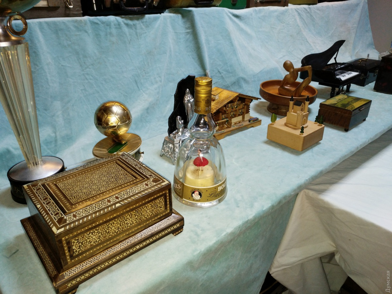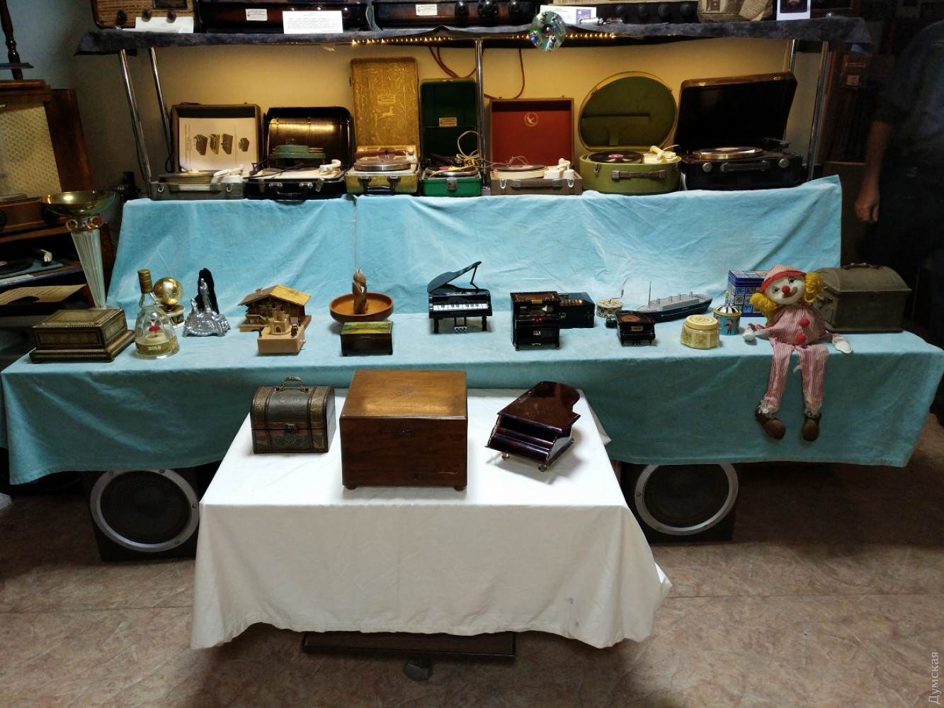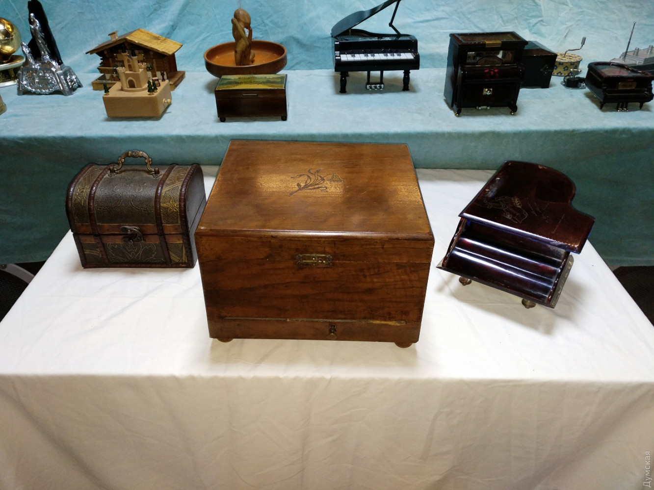 В одесском Музее звука открылась первая в нашем городе выставка музыкальных шкатулок. На ней представлены 22 экспоната, каждый из которых имеет свою историю. Корреспондент «Думской» Надежда Маркевич побывала на выставке и узнала много интересного о самом вожделенном подарке 1950-х годов и убедилась,что мода на музыкальные шкатулки снова возвращается. И без того умиротворенная атмосфера в Музее звука, теперь стала еще более медитативной. Мелодии, звучащие из этих утонченных изделий, способны ввести в нирвану любого. Изобретателем музыкальной шкатулки называют француза Антуана Фавра, который изготовил этот искусный механизм в далеком 1796 году. Он представляет собой вращающийся валик с иголочками, расположенными в определенном порядке, которые, цепляясь за зубцы металлического гребня, издают звук. Шкатулки были очень популярны в XIX и начале XX веков, до того времени, пока не появился граммофон. Действующая выставка – своего рода путешествие в прошлое! Два десятка артефактов родом из Германии, Израиля, Бельгии, Испании, Франции и конечно СССР, их собирали по аукционам и блошиным рынкам. Самый почтенный экспонат выставки, с которого и началась коллекция — 150-летний немецкий полифон. Директор музея Василий Пинчук случайно заметил ее на одном из аукционов и приобрел за триста с лишним долларов. Но жизнь шкатулки оказалась короткой – кто-то из посетителей музея резко рванул и сломал ключ для завода. Починить ее у сотрудников музея пока что не получается. «Я очень надеюсь, что найдется толковый токарь-фрезеровщик, который сможет нам помочь и шкатулочка снова запоет», — говорит заместитель директора музея Александр Власов. К сожалению, предыдущая история этого раритета неизвестна. Появление нового экспоната в музее стало толчком к поиску других шкатулок и расширению коллекции. Первой «подружкой» немецкого полифона стало изделие из Швейцарии 50-х годов в виде домика. Потом появилась копия шкатулки, в которой хранил свои перстни сам Наполеон Бонапарт. Под звуки классики в ней танцевала изящная балерина. Среди необычных экспонатов также шкатулка в виде пещеры, в которой стоит Дева Мария с младенцем. Такие изделия, говорит Александр Власов, дарили друг другу на Рождество. Есть в коллекции и специальная помолвочная шкатулка, которую дарили вместе с колечком, когда просили руки и сердца, а есть непосредственно свадебная — с танцующей парой внутри. Есть музыкальный ящик, который служил хранилищем для сигарет, а есть шкатулка-реклама французского напитка с золотой пылью внутри. Однако коллекция была бы не полной без творений современного Китая. Изделия из Поднебесной, хоть и сделаны из пластика, но притягивают взгляд посетителей не меньше, чем раритеты. Одна из них сделана в виде рояля, другая – по образу и подобию Титаника. Главное их отличие — отсутствие механики. Здесь музыка воспроизводится уже с помощью электроники. «Эти шкатулки мы приобрели после того как некоторые юные посетители стали задавать нам вопрос о наличии в шкатулке входа usb. Это уже такая современная деформация. Как оказалось, такое чудо техники действительно существует», — улыбается Александр Александрович. Встречаются среди китайского новодела и настоящие шедевры с механическим нутром. Одна из них представляет собой ящик, в котором при заводе вокруг деревянного 