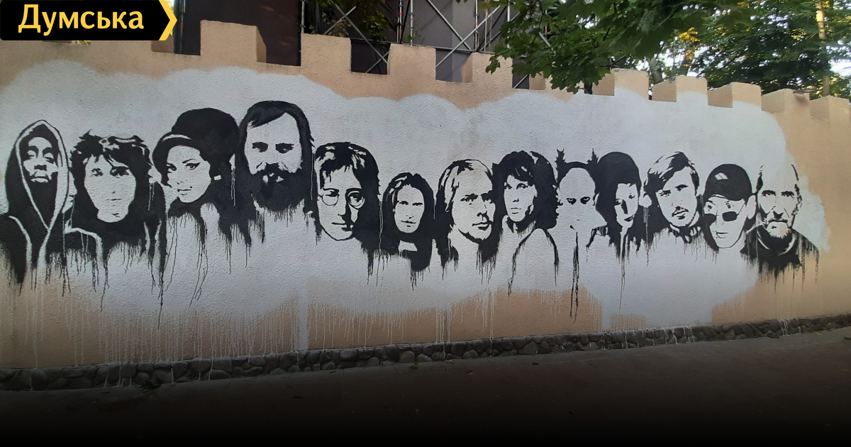 На стене изображены такие рок-легенды как Джон Леннон, Курт Кобейн, Эмми Уайнхаус, Виктор Цой и другие. Среди них есть и одесский композитор и музыкант Евгений Лапейко, который ушел из жизни в 2007 году.