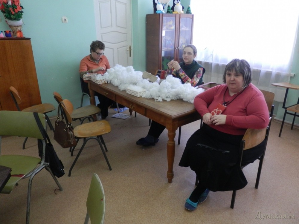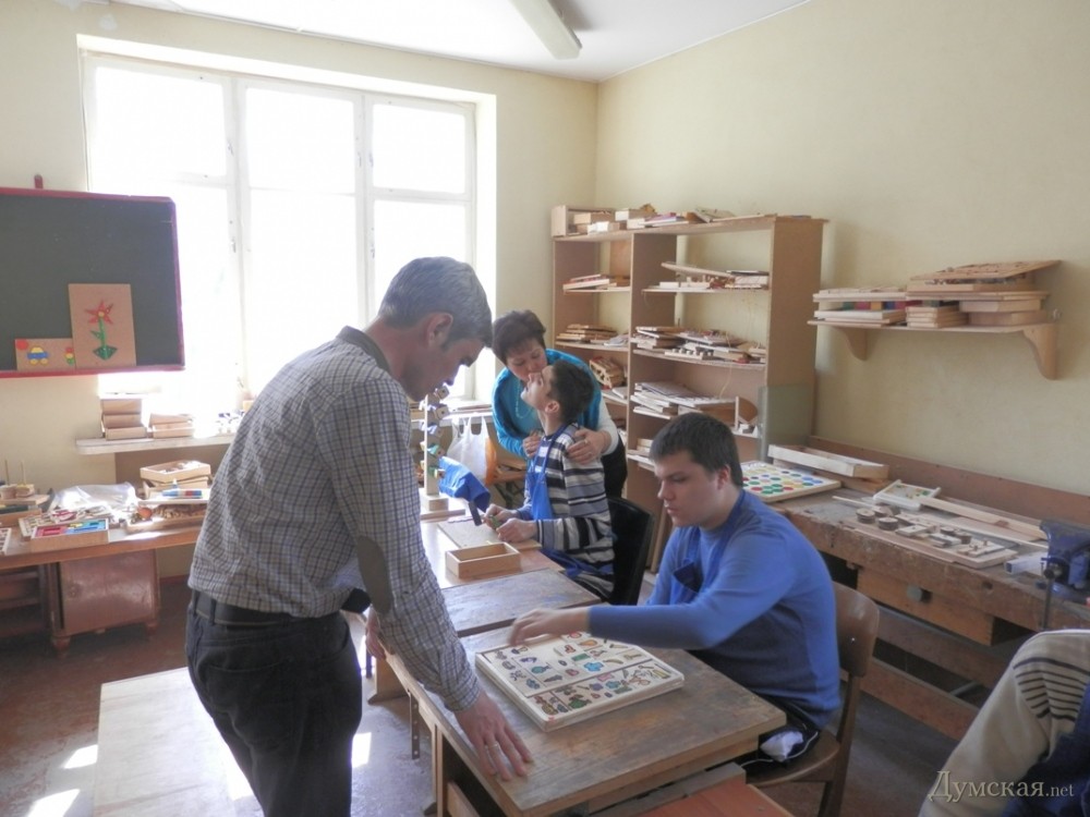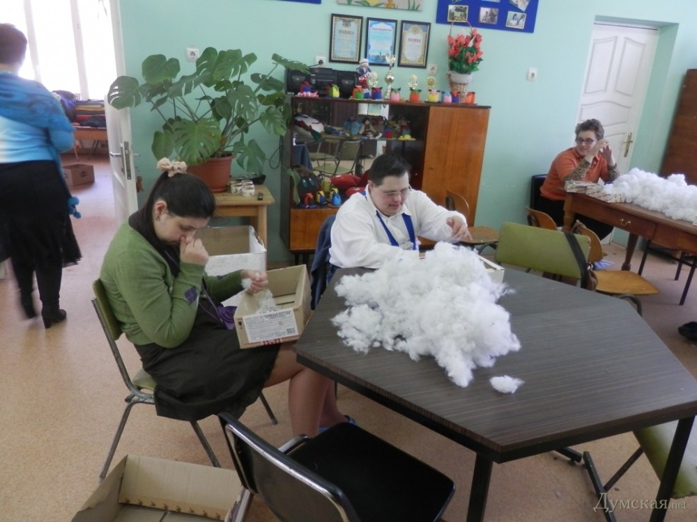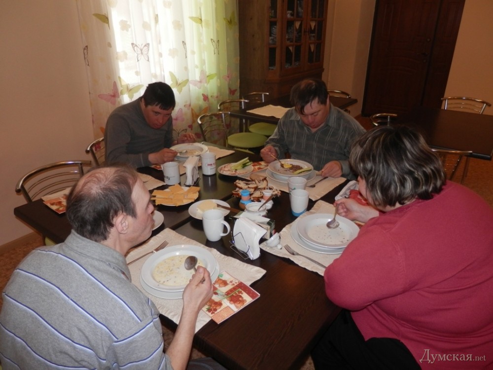 В начале апреля в Одессе открылся первый в городе центр независимого проживания инвалидов старше 18 лет. Общежитие расположилось в жилом доме на ул. Генерала Петрова, 8. Здесь «детей», как бережно называют своих подопечных социальные работники, учат самостоятельной жизни. Первыми обитателями общежития стали шестнадцать инвалидов с синдромом Дауна и умственной отсталостью от 18 до 47 лет. К жизни в центре их готовили заблаговременно, пока реставрировались помещения. «Нам удалось построить центр за полгода – помогали иностранные партнеры и некоторые одесские депутаты. Сейчас это инновационное коммунальное учреждение, способное дать инвалидам путевку в самостоятельную жизнь. Первую группу мы тщательно готовили, чтобы они ладили друг с другом», — рассказала директор Института реабилитации лиц с отклонениями психофизического развития им. Януша Корчака Марина Игонина. Так, в центре «детей» учат многому, даже самым простым вещам — ухаживать за собой, застилать постель, обустраивать свой быт, мыть посуду, стирать и многому другому. «Это очень важное и большое дело. Дочка первый день, конечно, переживала, а на выходных не могла дождаться, когда мы наконец сюда вернемся. Я довольна, ведь неизвестно, что будет со мной, а дочери еще жить и жить», — говорит мама одной из подопечных Ирина Сывороткина. Здесь же, в общежитии есть кризисная комната, рассчитанная на двух человек. Здесь могут оставаться те «дети», которые временно остаются без родительского надзора. «Родители, по сути, всю жизнь привязаны к таким детям, а им ведь тоже хочется куда-то съездить, решить какие-то свои вопросы. Вот для этого и существует кризисная комната», — продолжает Игонина. После завтрака, обитатели общежития отправляются на работу в Институт реабилитации. У каждого из них свое поле деятельности – тут есть и прачки, и мастера по набивке подушек, и помощники поваров и даже дворецкие. За свой труд они получают зарплату, правда, небольшую — около 500 гривен в месяц. «Но и такая сумма кажется для них невероятно большой. Кто-то тратит на что-то вкусное, другие копят на технику и всякие гаджеты. Кстати, однажды у нас был такой тест, мы спрашивали, сколько денег вам нужно для счастья. Одни говорили, миллион долларов, чтобы купить дом себе и родителям, а одна девушка сказала — 3 тысячи гривен, чтобы купить коляску для будущего ребенка. Потом в итоге она забеременела и родила здорового ребенка», — рассказывает Марина Игонина. Директор, несмотря на огромное количество подопечных (400 инвалидов, проходящих реабилитацию в центре) успевает уделить внимание каждому. Проходя по коридорам здания, она подходит к каждому, интересуется его настроением, кого-то подбадривает, а кому-то дает «нагоняй». Застаем картину, как малыш учится самостоятельно ходить на специальном тренажере, с усилием переставляет ноги, спотыкается и бессильно опускает на пол. «Не получается», — угрюмо констатирует паренек. «А ты старайся, тот кто чего-нибудь сильно хочет, обязательно это сделает, как бы тяжело ни было», — отвечает ему Игонина. Посмотрев на нее, мальчик встает и, уже улыбаясь, увереннее шагает. Свой подход у директора есть к каждому — к примеру, одиннадцатиклассник Виталик любит целоваться в щечки, а малыш из детской группы не пройдет мимо Марины Константиновны без жарких объятий. «Когда я пришла р