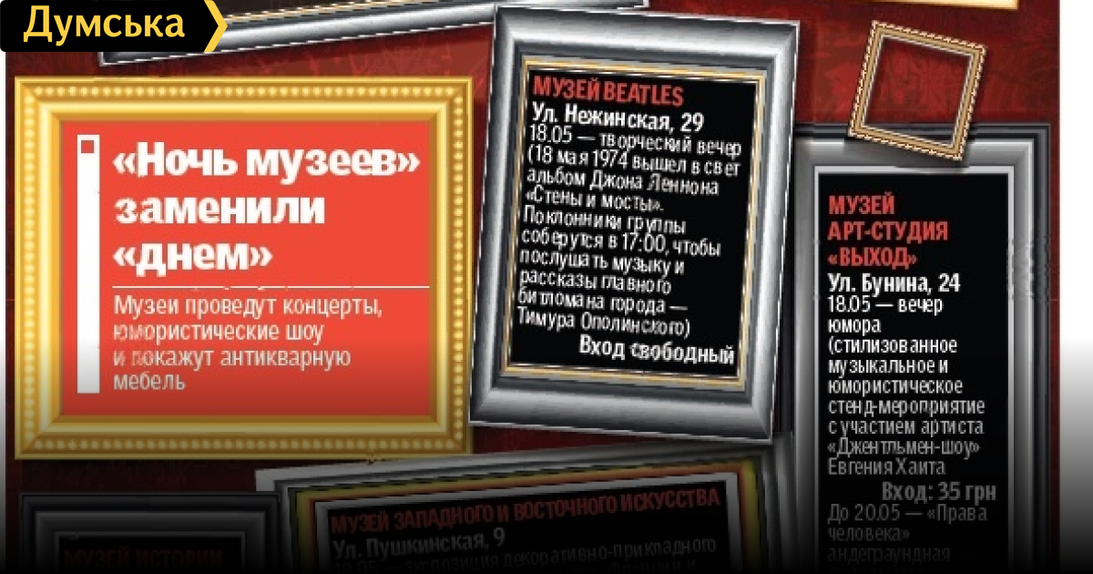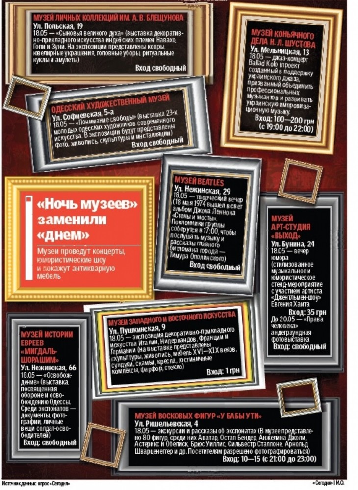 В Одессе отменили ежегодную «Ночь музеев», которая традиционно проводится в музеях мира в ночь с 17 на 18 мая, накануне международного праздника. В этом году, как сообщили в департаменте культуры, действо, перенесли в связи с политическими событиями, пишет газета «Сегодня». «Ориентировочно «Ночь музеев» состоится в середине июня», — сообщила глава департамента культуры горсовета Татьяна Маркова. Между тем сами музеи праздник не отменили, многие устроят 18 мая бесплатные показы или введут скидки. Так, в галерее нумизматики бесплатно продемонстрируют античные монеты и керамику Северного Причерноморья. Литературный, художественный, а также музей личных коллекций имени Блещунова тоже покажут экспозиции без денег, а «Ночь музеев» собираются провести 13 июня. Льготный вход за 1 гривну устроили в Музее западного и восточного искусства. «В основной выставке у нас антикварная мебель западноевропейских мастеров XVI и XIX веков, а также изделия из фарфора, стекла. В двух других — полотна художников Юрия Гуменного и Анатолия Сметанина», — поделилась сотрудник музея Екатерина Михейцева и добавила, что фотографировать экспонаты можно, но без вспышки. В галерее восковых фигур «У Бабы Ути» признались, что расстроены отменой «Ночи музеев» в этом году, но обещают установить льготные цены для «ночных посетителей» 18 мая. «С 21:00 до 23:00 будет 50%-я скидка на все категории билетов. Для взрослого вход будет стоить 15 грн вместо 30, а для ребенка 10», — рассказала администратор Наталья. Андеграундный музей «Выход» в честь праздника проведет музыкальное стенд-шоу с участием «одесского джентльмена» Евгения Хаита, брата известного актера Ростислава Хаита из театра «Квартет И». «Обычно у нас свободный вход, но из-за гостя мы установили цену 35 грн», — объясняет директор Владимир Подоляк. СМЕРТЬ РОСІЙСЬКИМ ОКУПАНТАМ! Помітили помилку? Виділяйте слова з помилкою та натискайте control-enter |