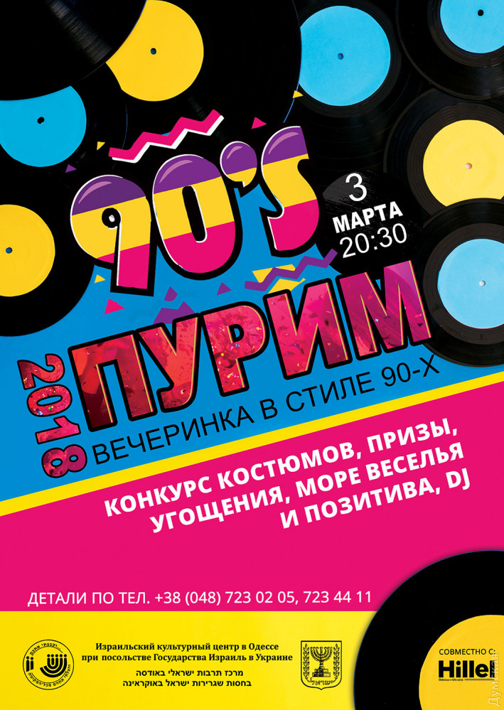 Израильский культурный центр зовет одесситов отпраздновать Пурим в стиле «бесшабашных 90-х». Вечеринка в честь чудесного спасения еврейского народа состоится 3 марта в отеле «Marlin» на Польском спуске, 13. «Мы все еще помним вкус Yupi, слова песен «Руки вверх» и правила игры в классики, хотя, кажется, это было сто тысяч лет назад. Мы уже давно переоделись в вещи в стиле «кэжуал», удобные конверсы, отрастили бороды или научились пользоваться мэйк-апом. Но в самый молодежный праздник пора достать с антресолей мастерки, спортивные штаны и кислотные лосины – мы будем отрываться в стиле бесшабашных 90-х! Кстати, за лучший костюм из прошлого мы вручим очень даже современный гаджет», — сообщают организаторы. На Пуримской вечеринке вас ждут разнообразные тематические интерактивы, конкурсы и призы. При входе гостей будет ждать тематическая фотозона. Вход на вечеринку по предварительной регистрации –https://goo.gl/2rmhZb и предъявлению паспорта. Начало в 20:30. Пурим — самый веселый иудейский праздник, отмечаемый по всему миру. В этот день 2,5 тысячи лет назад еврейскому народу, населявшему часть территории Персидской империи, удалось избежать полного истребления от рук злобного Амана, «премьер-министра» персидского царя Артаксеркса I. В память об этом дне верующие евреи всего мира устраивают публичные чтения свитка Есфири (одна из книг Танаха), раздают друг другу подарки и усаживаются за праздничный стол, угощаясь и выпивая. СМЕРТЬ РОСІЙСЬКИМ ОКУПАНТАМ! Помітили помилку? Виділяйте слова з помилкою та натискайте control-enter |
