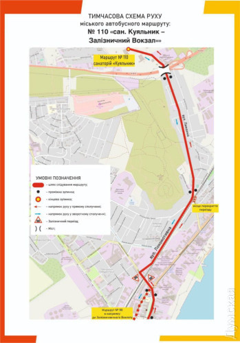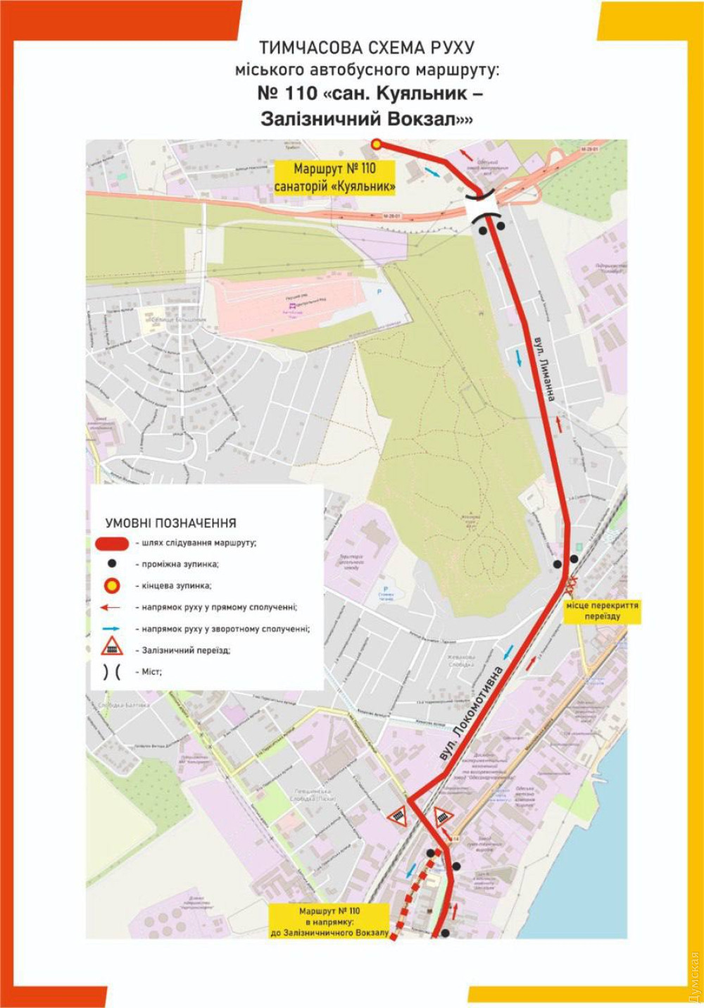 Крім того, змінить схему руху маршрутка №110. У бік санаторію «Куяльник» — від вул. Чорноморського Козацтва на вул. 7-му Пересипську, вул. Локомотивну, вул. Лиманну і далі за маршрутом. У бік залізничного вокзалу — від вул. Лиманної на вул. Локомотивну, вул. 7-му Пересипську, вул. Отамана Головатого і далі за маршрутом.