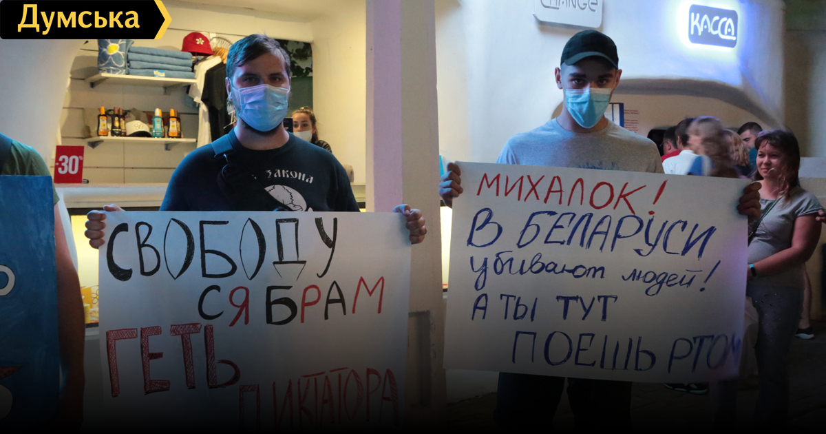 Около десятка молодых людей, которые собрались перед входом в ночной клуб, держали в руках плакаты «Михалок! В Беларуси убивают людей, а ты поешь тут ртом», «Свободу сябрам! Геть диктатора!», «Свободу політв'язням», «Ні - кривавій диктатурі» и «Stop violence in Belarus».