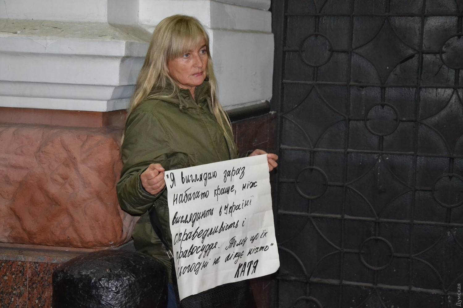 На Еврейской улице у стен Главного управления Национальной полиции в Одесской области состоялась акция памяти херсонской активистки Екатерины Гандзюк, которая скончалась в киевской клинике спустя три месяца после того, как ее облили серной кислотой.