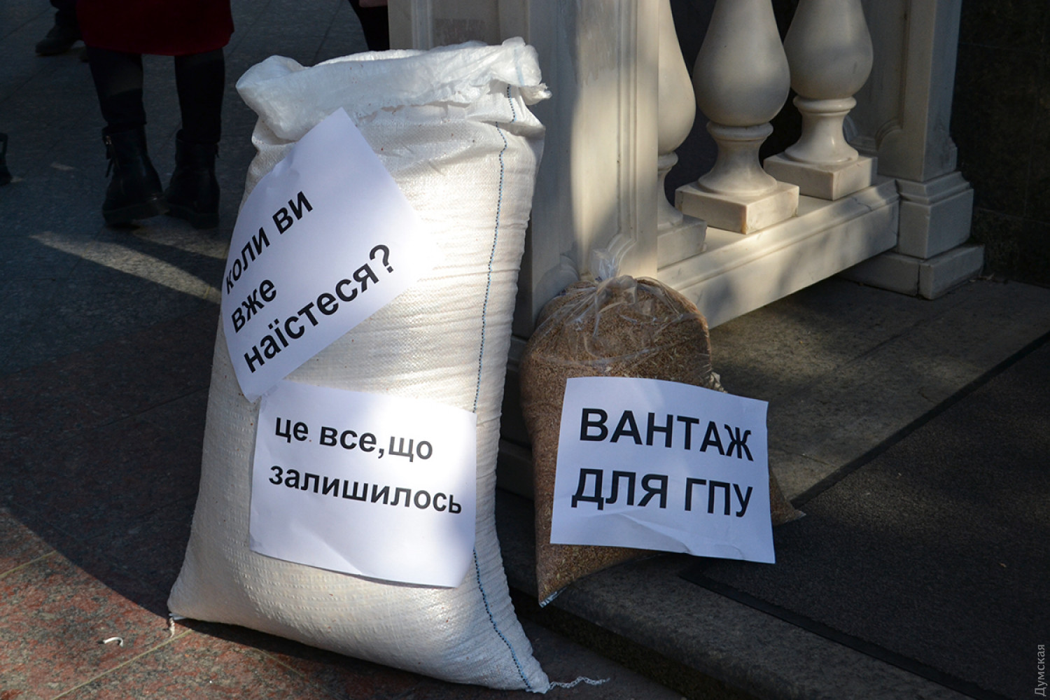 Сотрудники зернового терминала из Черноморска жаловались на убытки под зданием прокуратуры областиРаботники зернового терминала «Risoil», расположенного в морском порту Черноморск, заявляют, что терпят убытки из-за расследования, которое проводит Генеральная прокуратура Украины совместно с Государственной фискальной службой. Такое заявление они сделали на сегодняшней акции протеста возле прокуратуры Одесской области, передает корреспондент «Думской». Представитель группы Risoil S. A. Шота Хаджишвили обвинил правоохранителей в блокировании работы терминала: «Правоохранители пытаются изъять 3 тысячи тон зерна, которое принадлежит «Юнилайн» и мы готовы его отдать, если будет решение суда, но его нет, а следователь рассылает письма пограничной службе, Администрации морских портов, таможенной службе, чтобы остановили грузопоток с терминала «Risoil», и вот уже семь дней мы простаиваем и несем убытки в десятки миллионов гривен, — сетует Шота Хаджишвили. — У нас сейчас стоит 800 вагонов в простое, и «Укрзалізниця» выставляет счета за простой вагонов. Стоит загруженный танкер, документы которого не принимают; стоят три танкера, которые ожидаю погрузку – это дикие деньги». Сотрудники терминала оставили у входа в прокуратуру мешки с пшеницей, кукурузой и пакет с бутылками растительного масла, а после акции передали обращение на имя прокурора области и генпрокурора с просьбой «прекратить беспредел правоохранительных органов и разблокировать работу предприятия». Официально в прокуратуре обвинения в свой адрес не комментируют. Между тем известно, что к Risoil у правоохранителей, действительно, есть немало вопросов. С 2016 года по деятельности компании расследуется порядка семи уголовных производств. Должностным лицам предприятия инкриминируют уклонение от выплаты налогов с использованием ряда серых схем по минимизации, захват земельного участка и многое другое. СМЕРТЬ РОСІЙСЬКИМ ОКУПАНТАМ! Помітили помилку? Виділяйте слова з помилкою та натискайте control-enter |