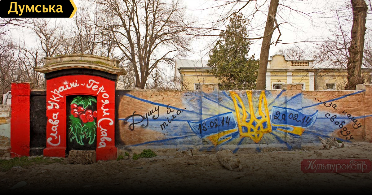В одесском парке Шевченко появился неофициальный мемориал Небесной сотни, выполненный в стиле граффити.Более 12 метров стены ярко раскрашены в традиционной украинской колористике. Одна половина граффити изображает дверь, увитую калиной, а вторая- трезубец и памятные даты, пишет «Культурометр». Автор произведения неизвестен.