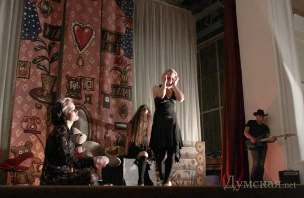 Начинается представление. Маленькая пьеса Августа Стриндберга «Кто сильнее», написанная, страшно сказать, в 1889 году, разыгрывается молодыми красотками-актрисами в духе легендарных «Служанок» Романа Виктюка. Что и неудивительно! Всеволод Ким, выпускник кафедры режиссуры цирка Российской Академии театрального искусства (бывший ГИТИС), имел счастье учиться у Валентина Гнеушева, который как раз и ставил пластику в «Служанках». Абсолютно без слов, только средствами танца и пантомимы проводит свою роль очаровательная блондинка с нежной, как бело-розовый зефир, кожей Вика Икрова. Этакая змея-искусительница извивается по сцене в черном кружевном комбинезоне… Вика родом из Ровно, в Одессу переехала только летом нынешнего года, у нее несомненный поэтический дар и ряд самостоятельно организованных перформансов, успела и поработать арт-директором галереи современного искусства. Чертовски обольстительна, пластична, да еще и семь языков одновременно изучает. Клад, а не девушка. Стриндберг на том свете кусает истлевшие локти, жалея, что не стал ее современником!